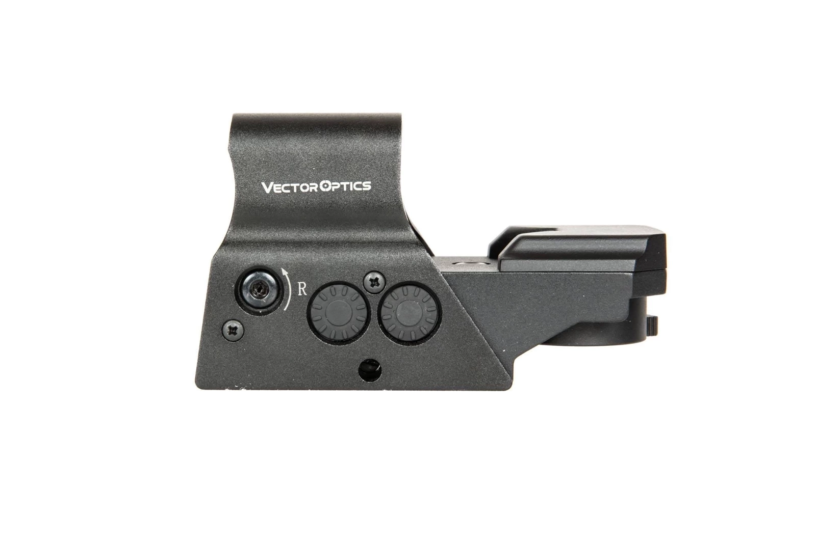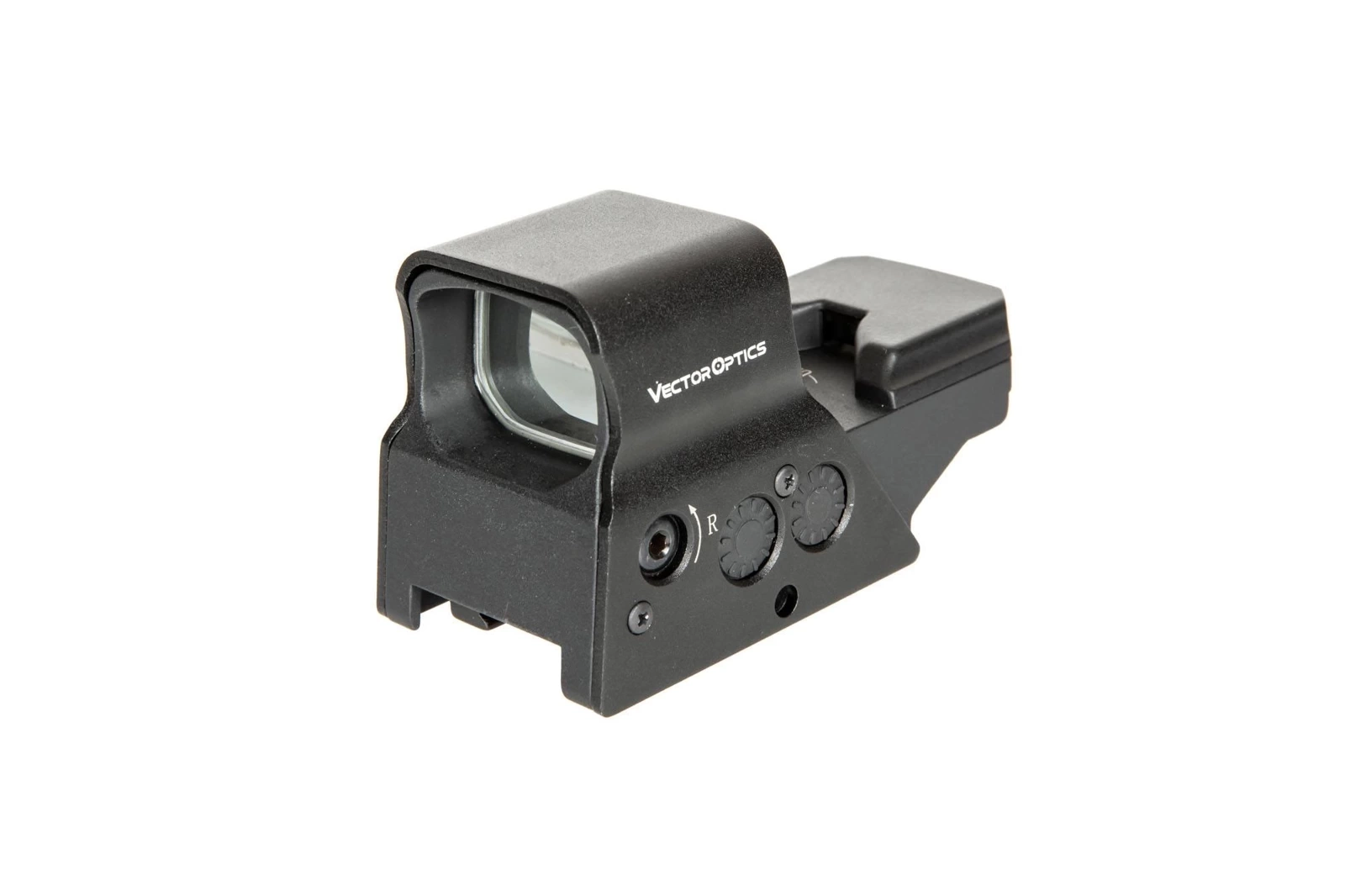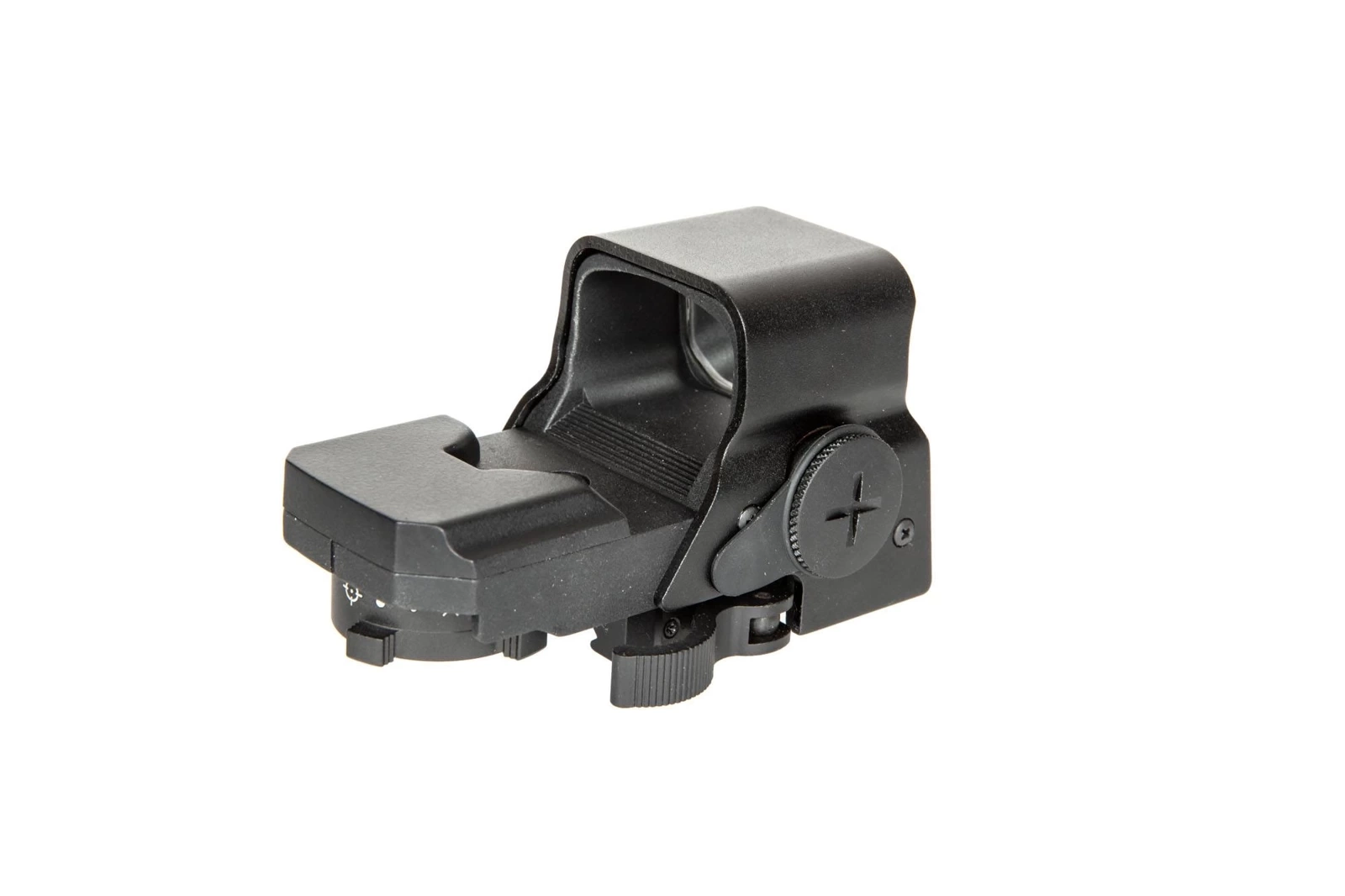 Wykonany z wytrzymałego aluminium kolimator. Kolimator zasilany jest baterią CR2032. Montowany na standardowej szynie RIS 22mm. Posiada w sumie 5 stopni podświetlenia punktu celowniczego w kolorze czerwonym i zielonym. Urządzenie posiada 8 wzorów punktów celowniczych.