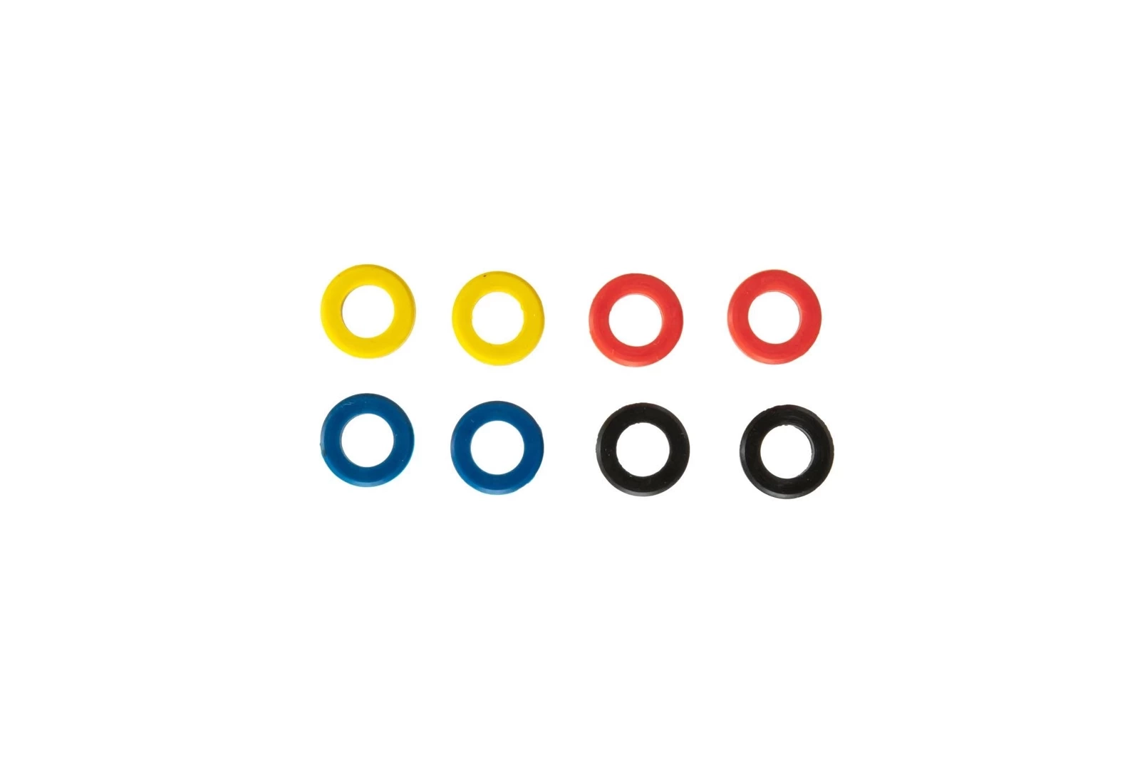 W zestawie znajdują się 4 rodzaje po 2 sztuki podkładek o różnej twardości: 45° żółte / 55° czerwone / 65° niebieskie / 75° czarne. Prócz polimerowych podkładek w zestawie znajdują się 3 rozdzielające, stalowe podkładki. Dzięki takim rozwiązaniom użytkownik może dowolnie wybrać odpowiednie ustawienie.
