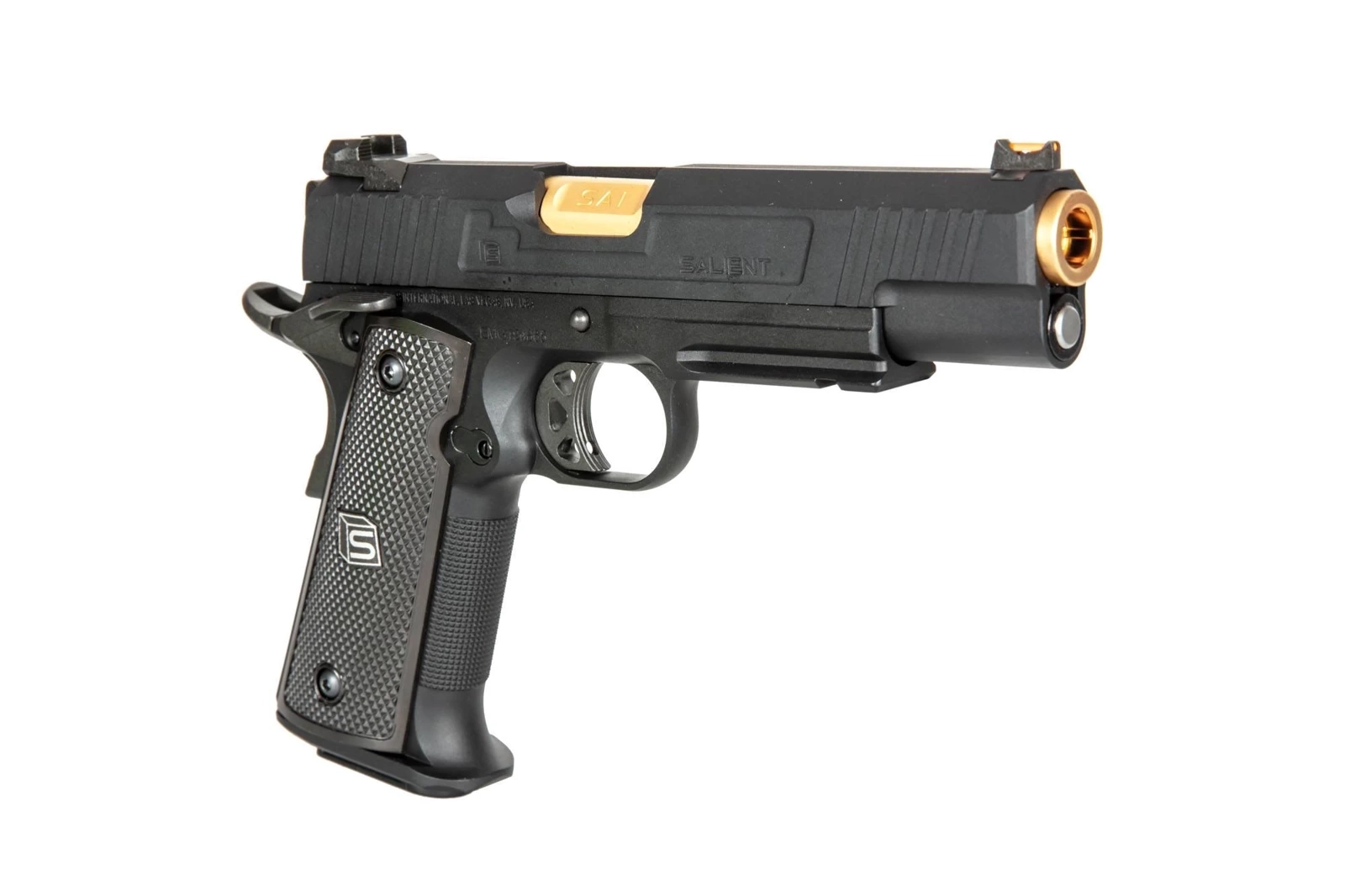 Na metalowy zamek oraz korpus naniesiono oryginalne oznaczenia producenta Salient Arms International™Replika zaopatrzona jest w dwustronny bezpiecznik skrzydełkowy blokujący mechanizm spustu i uniemożliwiający oddanie przypadkowego strzału. Dostęp do bezpiecznika jest bardzo prosty zarówno dla osób lewo- jak i praworęcznych - dźwignia mechanizmu znajduje się w zasięgu kciuka. W modelu tym zastosowano funkcjonalny tylny bezpiecznik dociskowy, który wymusza prawidłowy chwyt w celu oddania strzału. Customowy język spustowy oraz dźwignia kurka nadają replice ciekawy, przyciągający wzrok wygląd. Wzrok przykują także pomalowane na złoty kolor elementy lufy zewnętrznej.