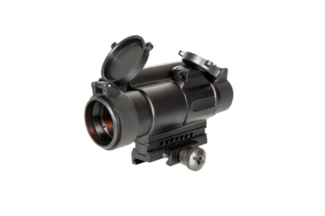 Celownik kolimatorowy firmy JJ Airsoft z obudową wykonaną w całości z metalu, pasujący do wielu rodzajów karabinów i karabinków ASG. Kolimator wyposażono w zintegrowany montaż na standardową szynę 22mm RIS oraz dwie osłony flip-up do ochrony szkieł.