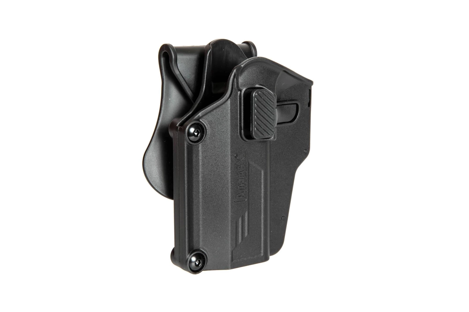 Wyprodukowana z wytrzymałego polimeru przez firmę Amomax kabura uniwersalna do replik. Dzięki specjalnej konstrukcji, kabura jest kompatybilna z ponad 80 rodzajami pistoletów, w tym najpopularniejszymi jak Glock, Sig Sauer, CZ, Ruger, Beretta czy Colt 1911.