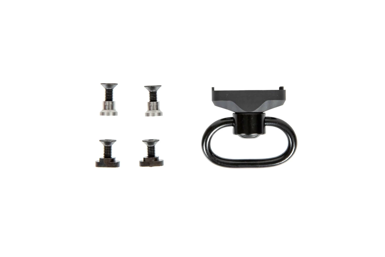 Zestaw składa się z montażu na szynę KeyMod / M-LOK oraz wykonanego ze stali zaczepu pasa nośnego typu QD.