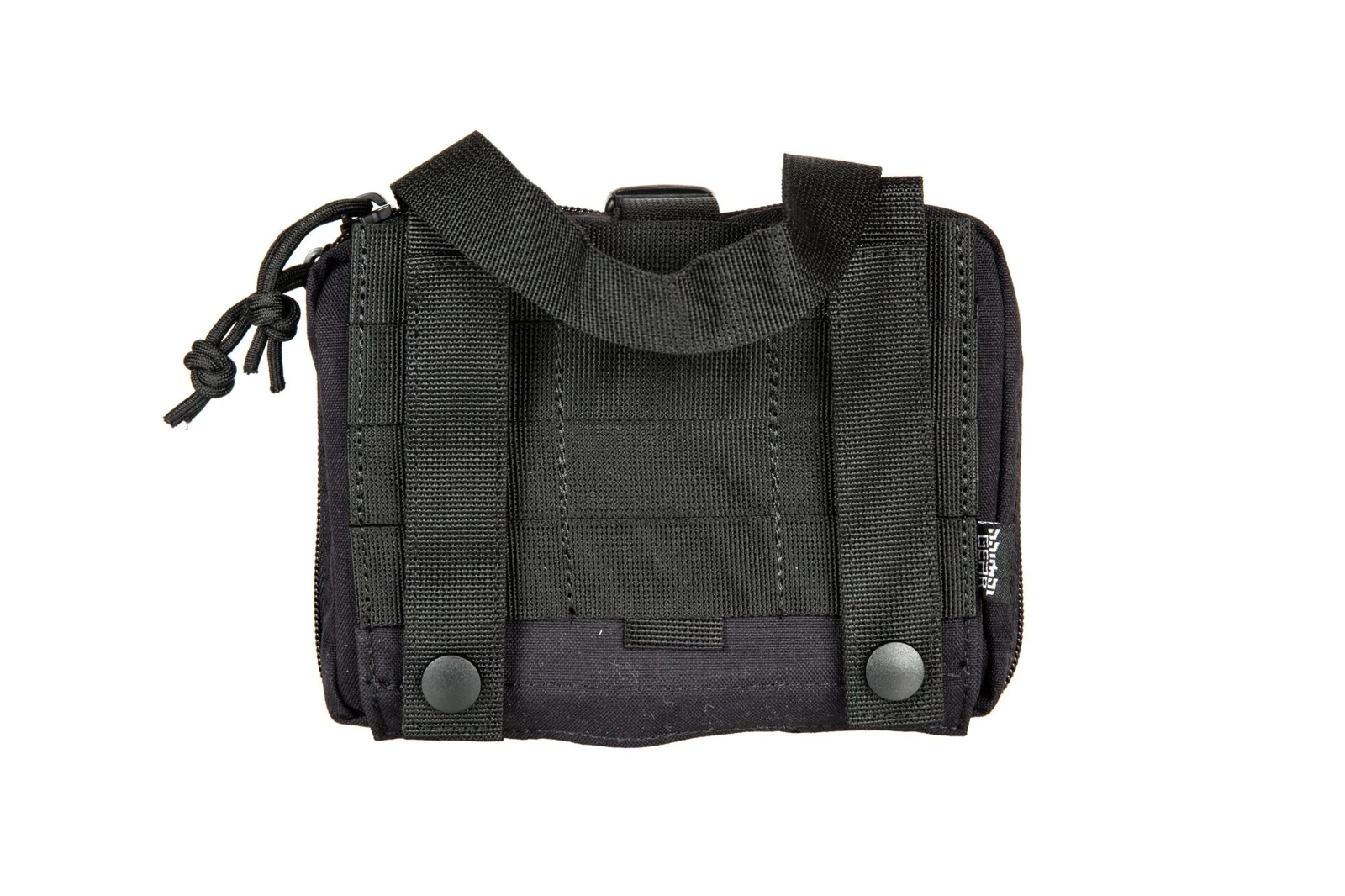 Ładownica dodatkowo zabezpieczona jest taśmą z klamrą. Na przedniej ściance apteczki znajduje się mała płaska kieszonka zamykana na rzep oraz mały panel rzepowy np. na moral patch.