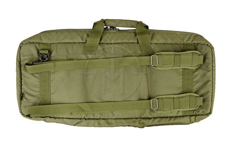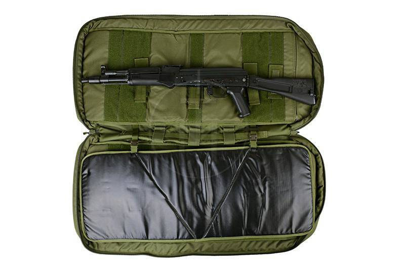 Pokrowiec został wykonany w większości z wytrzymałego nylonu.. Wewnątrz znajduje się miejsce na 2 repliki - oddzielone są od siebie zdejmowaną przegrodą, mocowane za pomocą kieszeni na lufę oraz pasków velcro. Po zapięciu replika trzyma się stabilnie i nie ma mowy o jej przemieszczeniu.