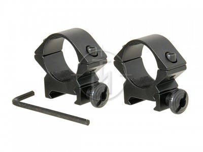 Wysokiej jakości montaż wykonany z metalu. Montowany na szyny RIS 22mm lub 20mm za pośrednictwem wygodnej śruby. Montaż składa się z dwóch pierścieni o średnicy 25mm. Dzięki nim możliwe jest zamontowanie celownika optycznego o dowolnej długości.