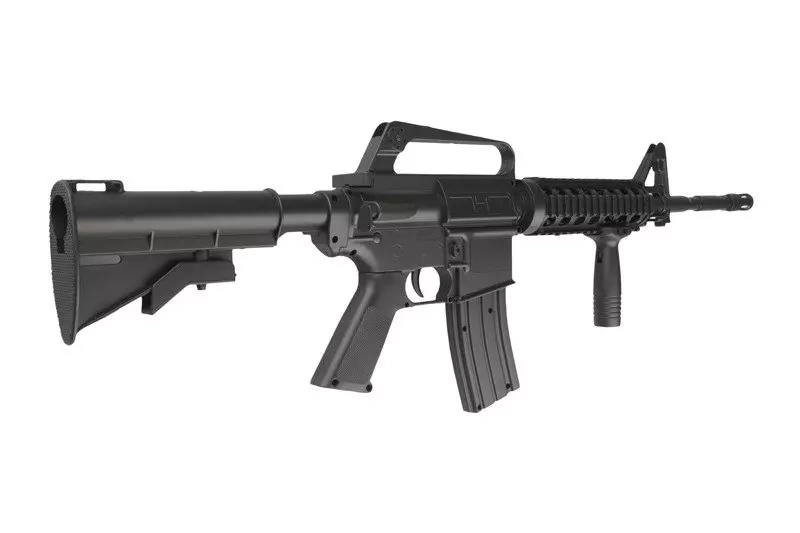 Replika karabinka szturmowego A4 wykonana została z wytrzymałego ABS-u. Charakteryzuje się dobrą jakością wykonania i dbałością o szczegóły takie jak przestawny przeziernik w rączce transportowej. W standardzie replika została wyposażona szyny RIS zamiast typowego dla M4 przedniego chwytu. Dzięki temu zyskujemy możliwość montażu dodatkowych akcesoriów – taktycznej rączki i repliki wskaźnika laserowego.