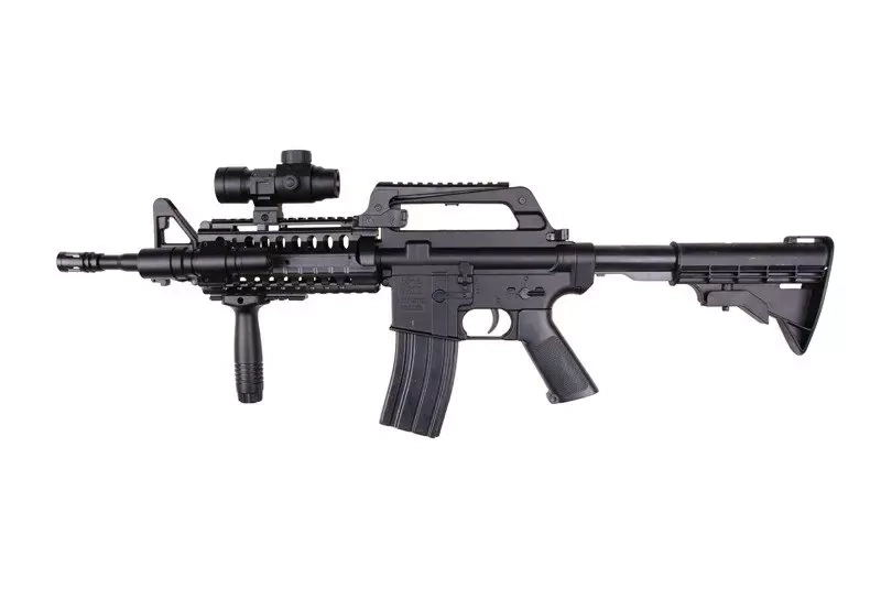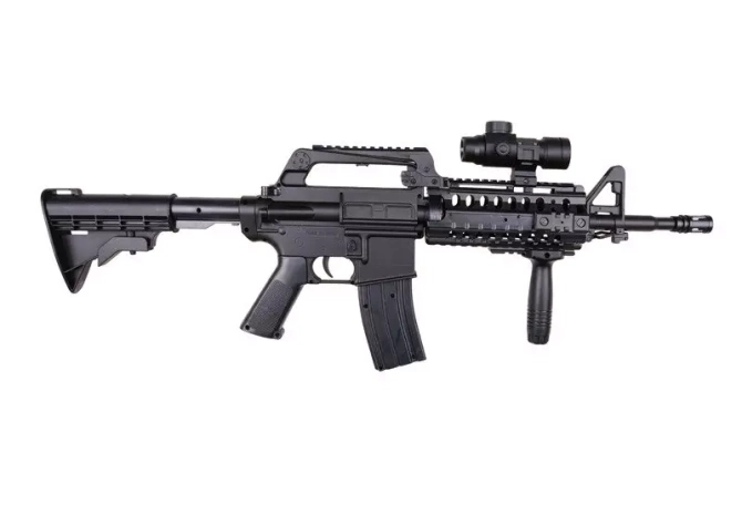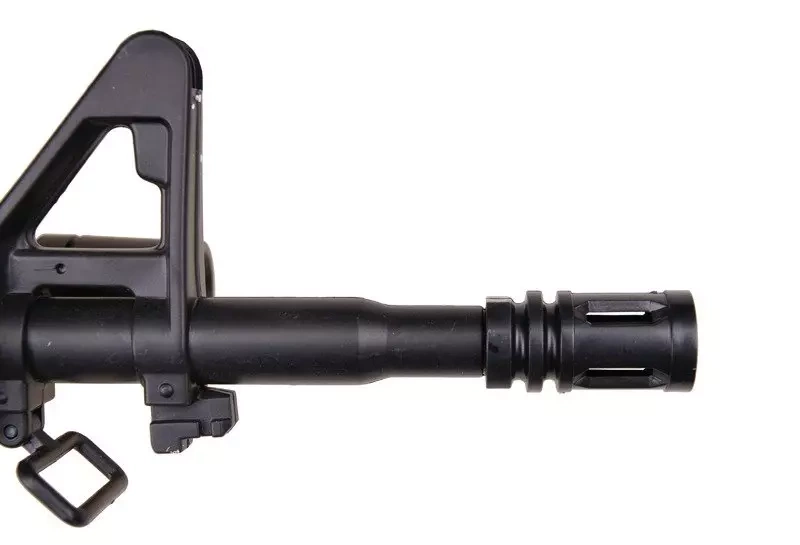 Replika karabinka szturmowego MR-733 wykonana została z wytrzymałego tworzywa sztucznego. Charakteryzuje się dobrą jakością wykonania i dbałością o szczegóły takie jak przestawny przeziernik w rączce transportowej czy szyn RIS. W standardzie replika została wyposażona w konwersję CASV z szynami RIS, dzięki czemu zyskujemy możliwość montażu dodatkowych akcesoriów – chwytu przedniego i latarki taktycznej. Dodatkowo dzięki szynie RIS zachodzącej na chwyt transportowy mamy możliwość zamontowania celownika kolimatorowego w dodatkowym miejscu.