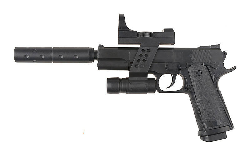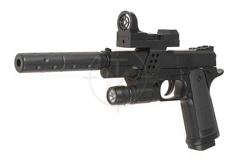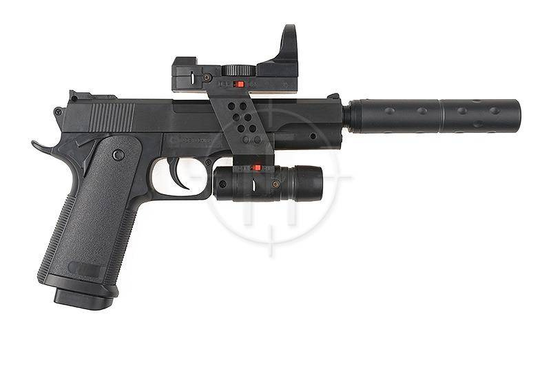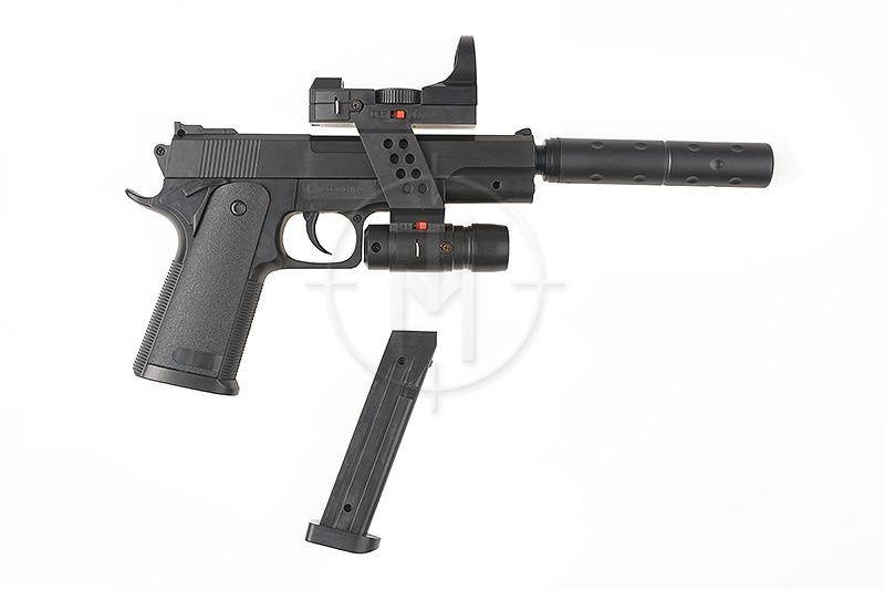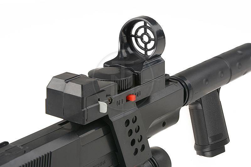 Wykonanie: tworzywo sztuczne Prędkość wylotowa: ~110 FPS Długość: 225mm Waga: 235/305g Kolor: czarny W zestawie celownik optyczny, tłumik i laserowy wskaźnik celu