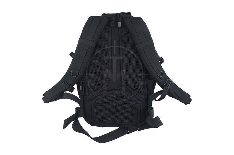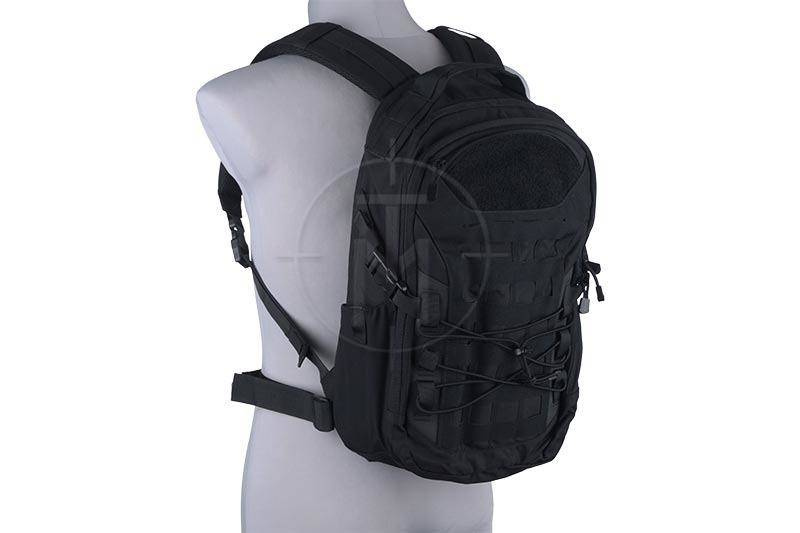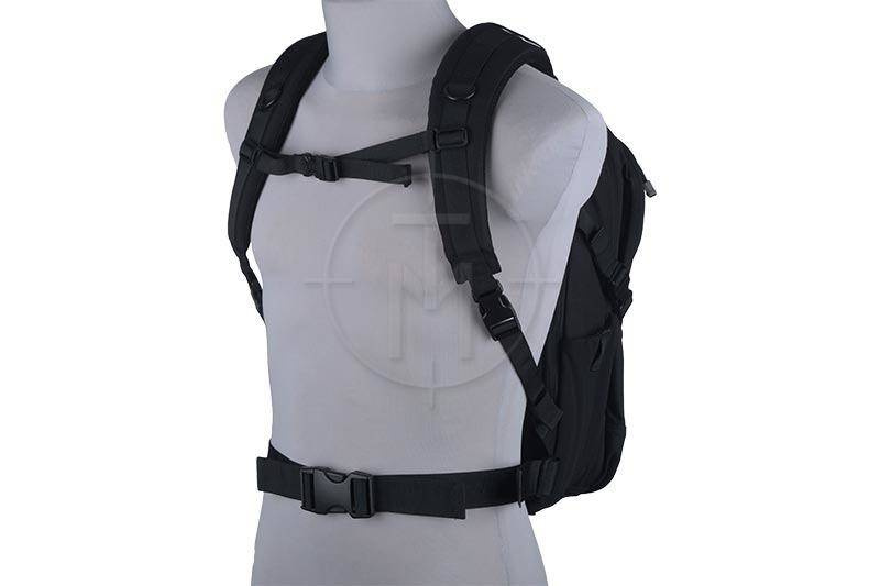 Zewnętrzna strona plecaka wyposażona jest w system montażowy MOLLE oparty na wyciętym laserowo materiale tzw. Laser-Cut, prócz tego znajdziemy tu panel rzepowy oraz gumowe, kompresujące linki. Po bokach plecaka znajdują się kieszonki np. na butelkę wody oraz pasy kompresyjne. Duża, zamykana na zamek błyskawiczny kieszeń znajdująca się po wewnętrznej stronie plecaka przeznaczona jest na bukłak hydracyjny, wężyk poprowadzić można przez specjalny otwór w górnej części plecaka.