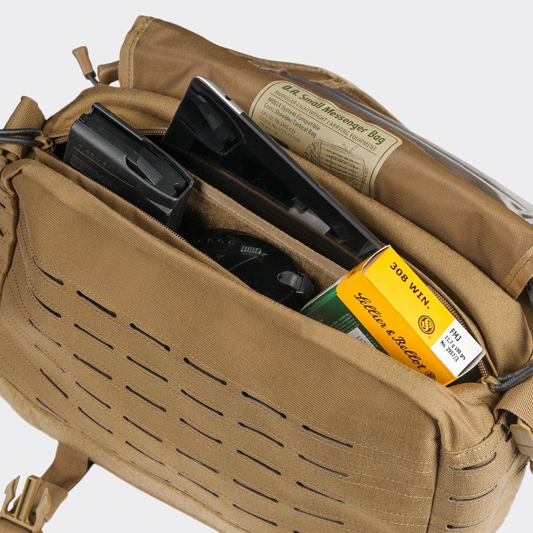 Direct Action® Small Messenger Bag® to lekka, kompaktowa i uniwersalna torba typu grab-bag. Komora główna torby pokryta została w całością pętelkową częścią Velcro, co umożliwia mocowanie dodatkowego wyposażenia takiego jak kabury czy ładownice. Na tylnej ścianie tej komory znajduje się obita pianką kieszeń dedykowana do bezpiecznego przenoszenia 11" laptopa lub innych urządzeń elektronicznych. D.A. Small Messenger Bag® została pokryta wycinanym laserowo systemem kompatybilnym z MOLLE/PALS. Torba wyposażona jest w regulowany pasek naramienny z poduszką pokrytą materiałem antypoślizgowym.