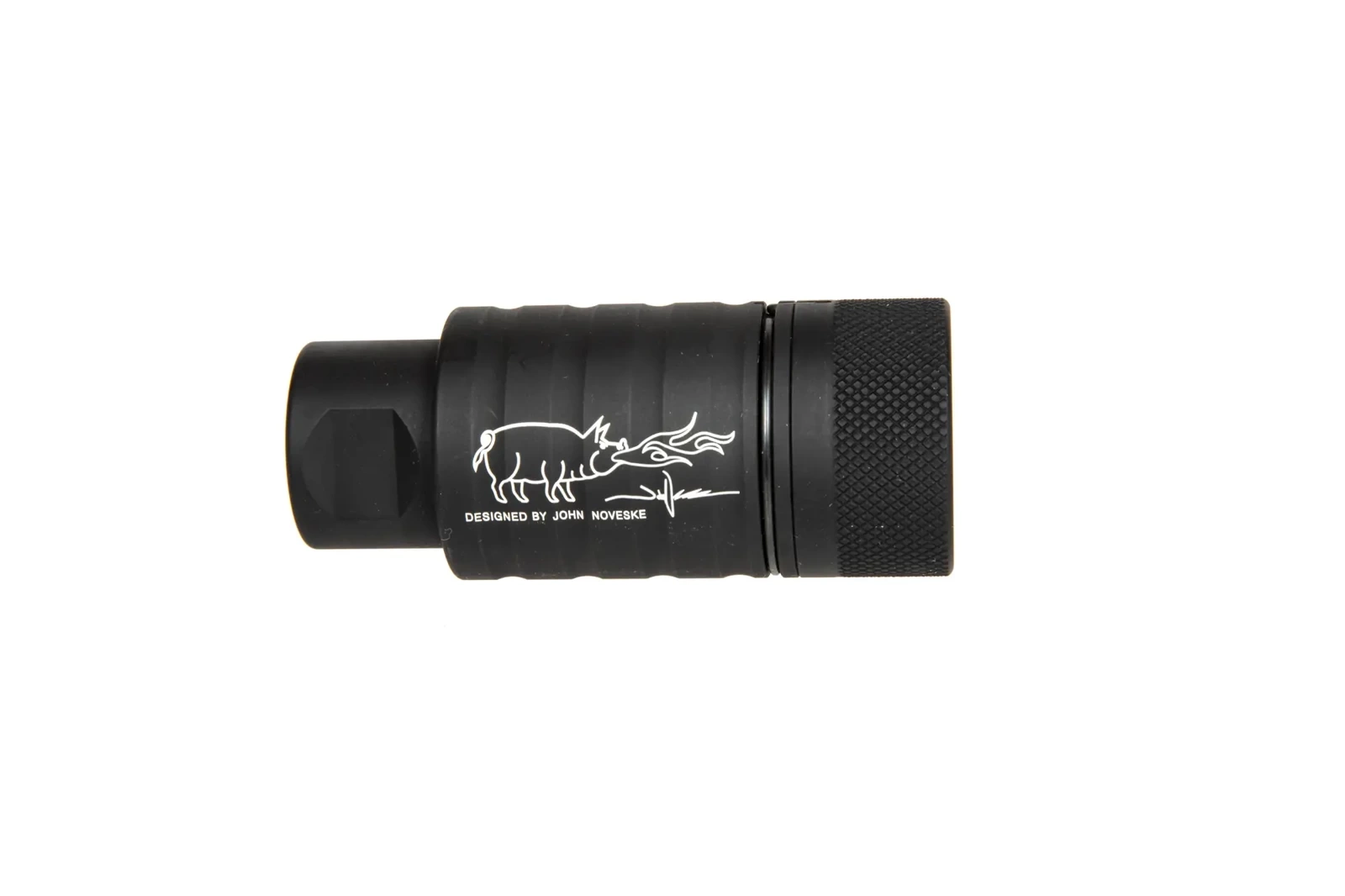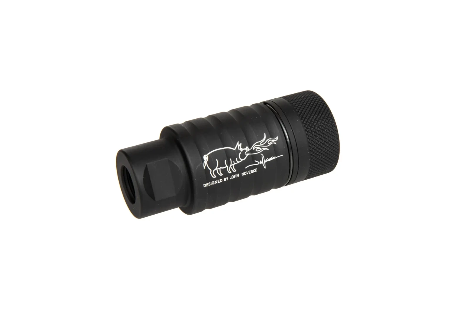 Replika urządzenia wylotowego typu aplifier firmy Madbull z oznaczeniami producenta akcesoriów do broni palnej Noveske®. Model wzmacnia dźwięk strzału, skupiając wychodzące z lufy powietrze, przez stożkowy wkład w jednym kierunku. Korpus tłumika został wykonany obrabianego numerycznie anodyzowanego aluminium. Wkład nagłaśniający został wykonany z czernionej stali.