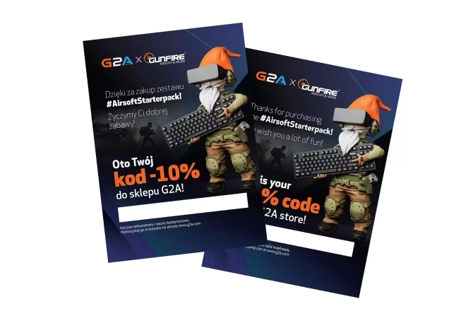 Voucher z kodem rabatowym -10% na zakupy w sklepie G2A. Voucher jest dostępny jako gratis w zestawie #AirsoftStarterpack!