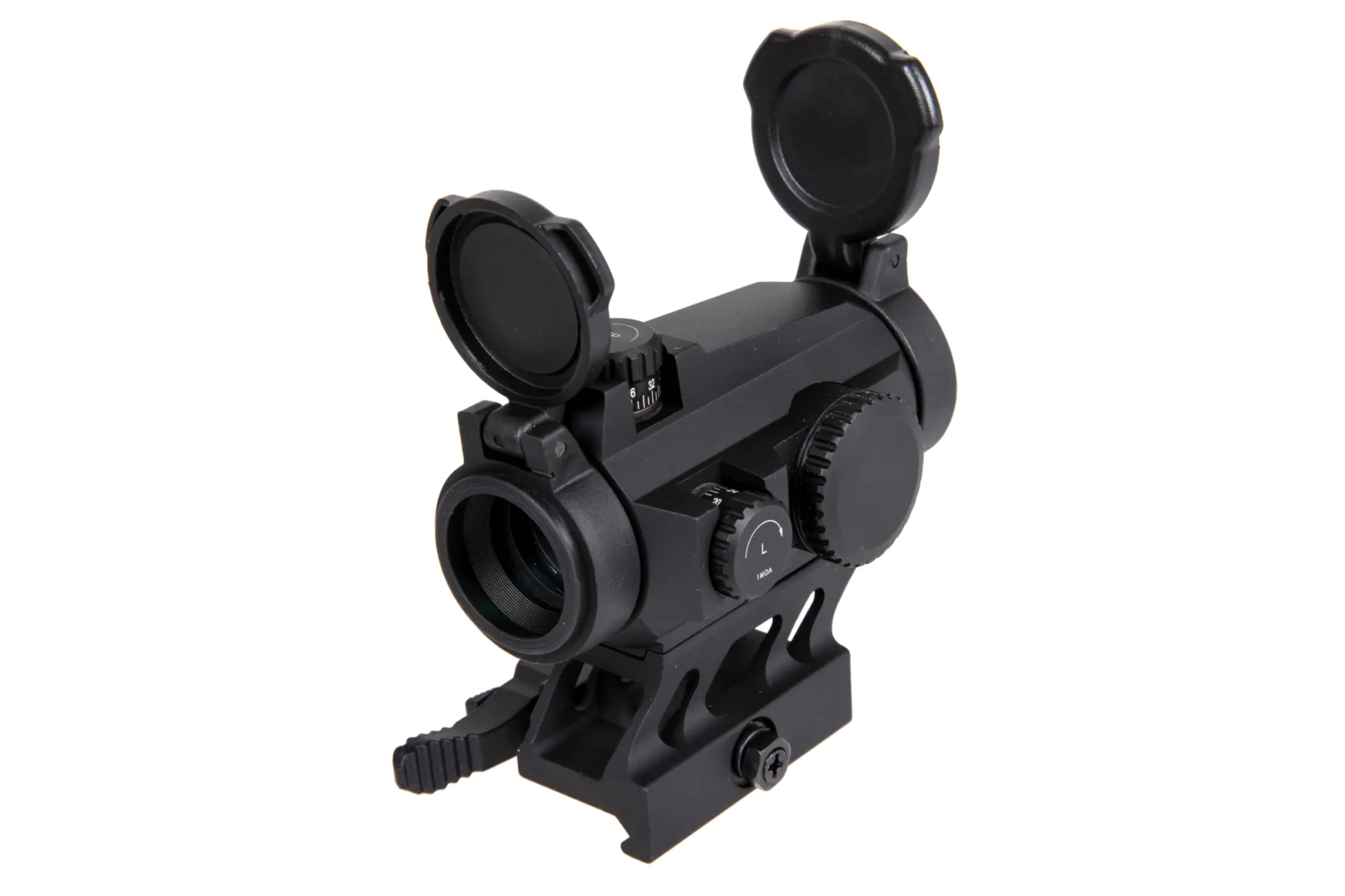 Wykonany z wytrzymałego aluminium kolimator od firmy Vector ;Celownik zasilany jest baterią CR2032 i w zestawie posiada 2 montaże: wysoki oraz niski. Montowany na standardowej szynie RIS 22mm. Model posiada dwa typy punktów celowniczych, standardową kropkę 2MOA oraz siatkę celowniczą typu EOT. Oba punkty celownicze mają 9 stopni jasności, 8 dziennych i 1 przystosowany pod noktowizję.