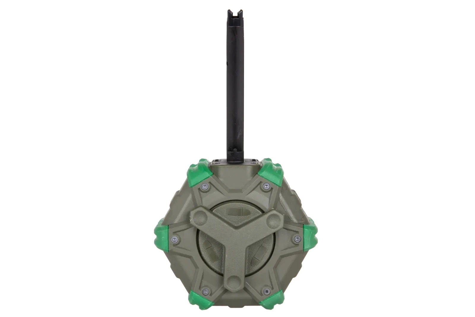 Wykonany z wytrzymałego tworzywa sztucznego oraz metalu magazynek bębnowy o pojemności 350 kulek. Magazynek gazowy pasuje do replik gazowych (Green-Gas) typu 1911. Wsyp kulek znajduje się z boku magazynka, z przodu zaś znajduje się mechanizm podkręcający kulki. Na dole magazynka znajduje się wlew gazu do dużego ;