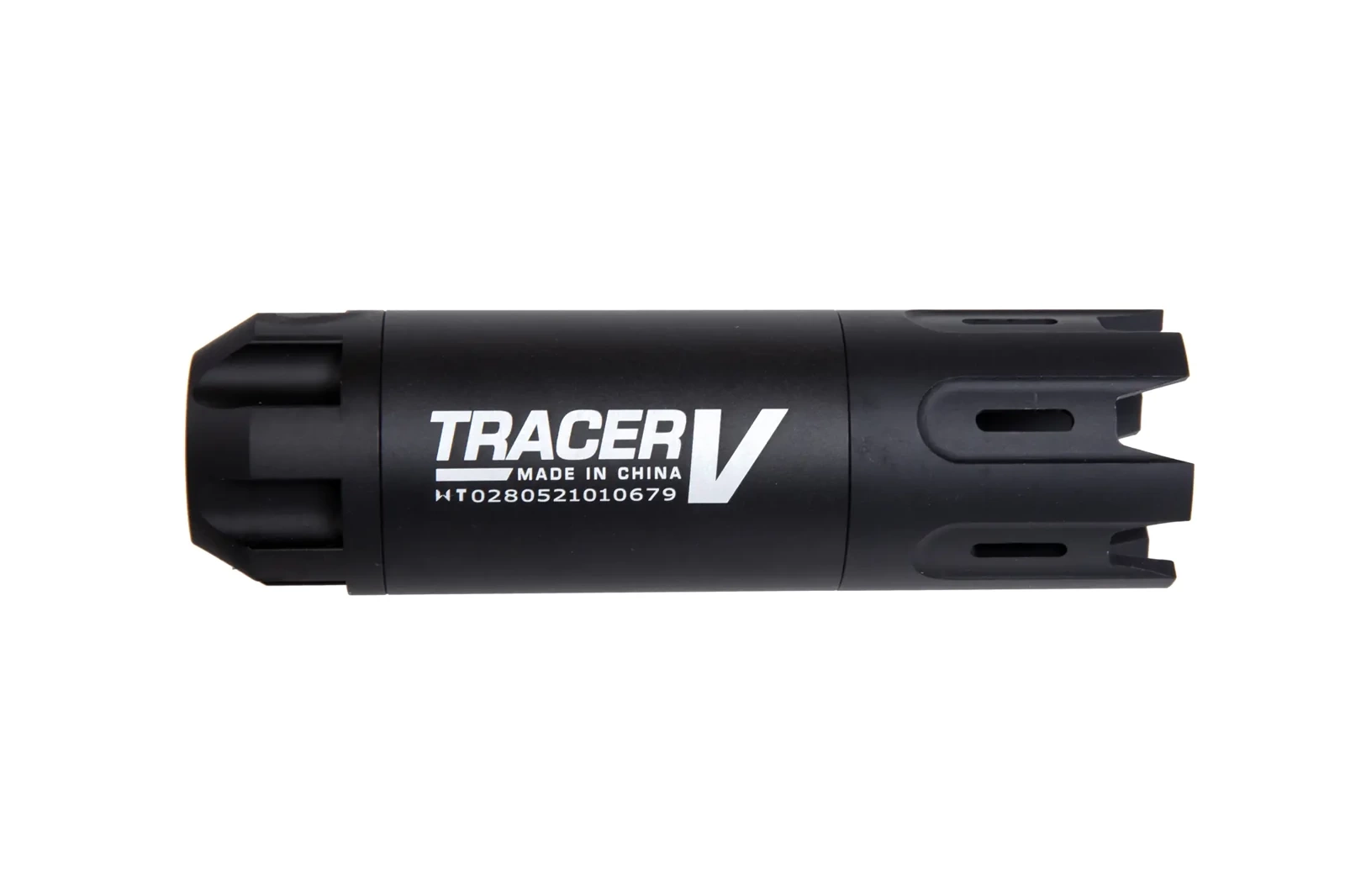 Wykonany z wytrzymałego aluminium i tworzywa sztucznego wysokiej jakości Tracer w formie tłumika dźwięku. Tłumik może naświetlić maksymalnie 35 kulek/sekundę. Model naświetla kulki zielone ASG oraz Gelblaster, pełne naładowanie starcza na 4 godziny pracy, włącznik znajduje się na zewnątrz obudowy. Tracer został również wyposażony w diodę symulującą błysk wystrzału w 7 kolorach oraz w trybie wielokolorowym.