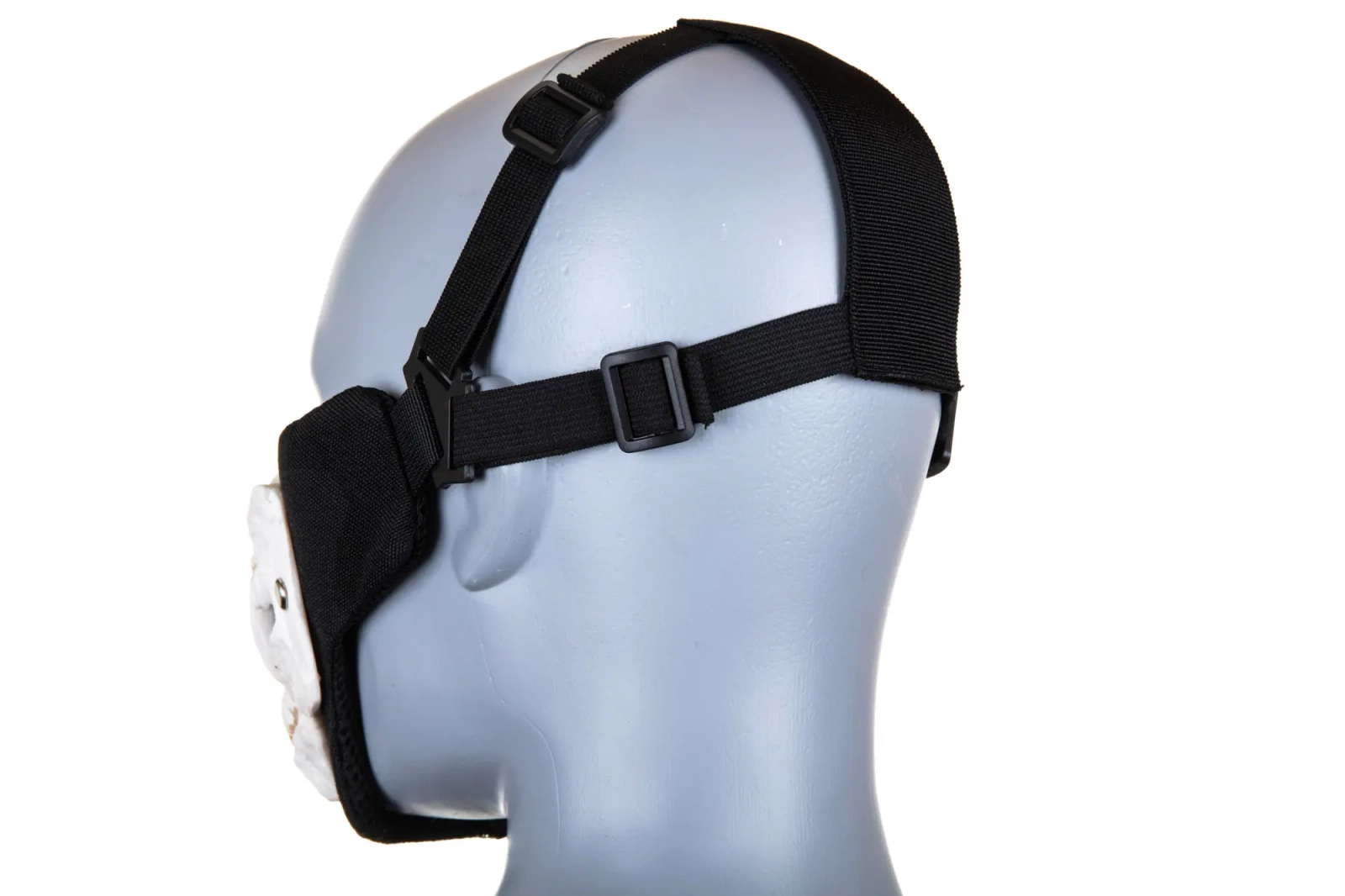Maska typu Stalker w odchudzonej i bardzo lekkiej edycji Evo. Maska wykonana została z wytrzymałego nylonu opiewającego jej zewnętrzną część oraz mocnej aczkolwiek lekkiej stalowej ;Maska została wyposażona w gumową szczękę, co nadaje jej groźny ;Wewnątrz, na policzkach, maska posiada przyjemne, gąbkowe wypełnienie typu mesh znacznie poprawiające komfort użytkowania. Siatkę natomiast pokryto specjalnym laminatem uodparniającym ją na warunki atmosferyczne a tym samym rdzę. Dzięki zamontowaniu siatki jedynie po środku ochraniacza, maska nie ciąży oraz nie wymaga dodatkowego modelowania. Co więcej praktycznie sama układa się do twarzy pozostawiając duży komfort swobodnego oddechu przy jednoczesnej osłonie najbardziej newralgicznych części twarzy. Stabilność zapewniają 4 regulowane paski z szeroką taśmą centralną opiewającą większą część potylicy.