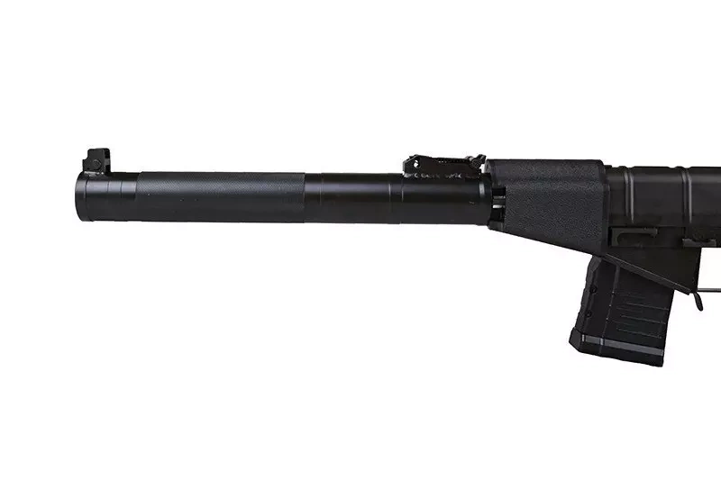 Replika posiada specjalnie zaprojektowany koszyk silnika - po to, aby można było zastosować chwyt pistoletowy o kształcie zgodnym z oryginałem. Sercem repliki jest wytrzymały gearbox wyposażony w 9mm łożyska, w którym zamontowano szereg wzmocnionych podzespołów, komplet stalowych zębatek, poliwęglanowy tłok, stalową, łożyskowaną prowadnicę sprężyny oraz aluminiową, wentylowaną głowicę tłoka. Akumulator repliki mieści się wewnątrz atrapy tłumika dźwięku, bez problemu zmieścimy w środku np. 2-dzielny bądź 3-dzielny akumulator typu LiPo. Tłumik demontuje się w kilka sekund: po naciśnięciu jednego przycisku blokującego, więc nie potrzeba do tej operacji żadnych narzędzi. Na skuteczność prowadzenia ognia wpłynie też znacząco precyzyjna lufa wewnętrzna tight bore o średnicy 6,02mm.