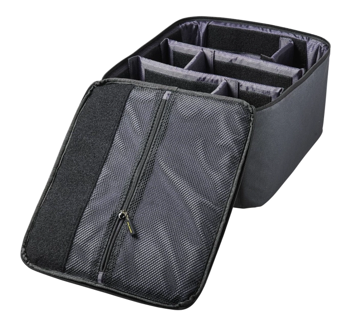 Wkładka organizacyjna jest zamykana na dwa dwubiegunowe zamki błyskawiczne, została wyposażona w wygodny chwyt transportowy.