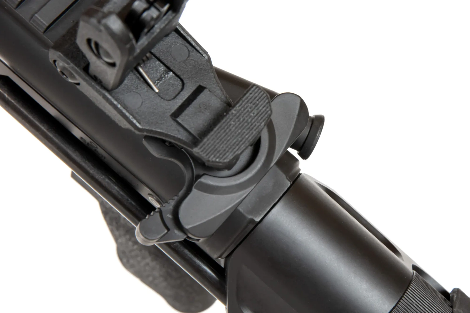 Replika karabinka SA-E17 wyposażona jest w frontową szynę w systemie montażowym M-LOK wyprodukowana na licencji firmy Strike Industries. Pod szyną zamontowano wygodny, kątowy chwyt taktyczny ułatwiający operowanie repliką. Lufa zakończona jest standardowym urządzeniem wylotowym. Na grzbietowej szynie RIS zamontowano składane przyrządy ;