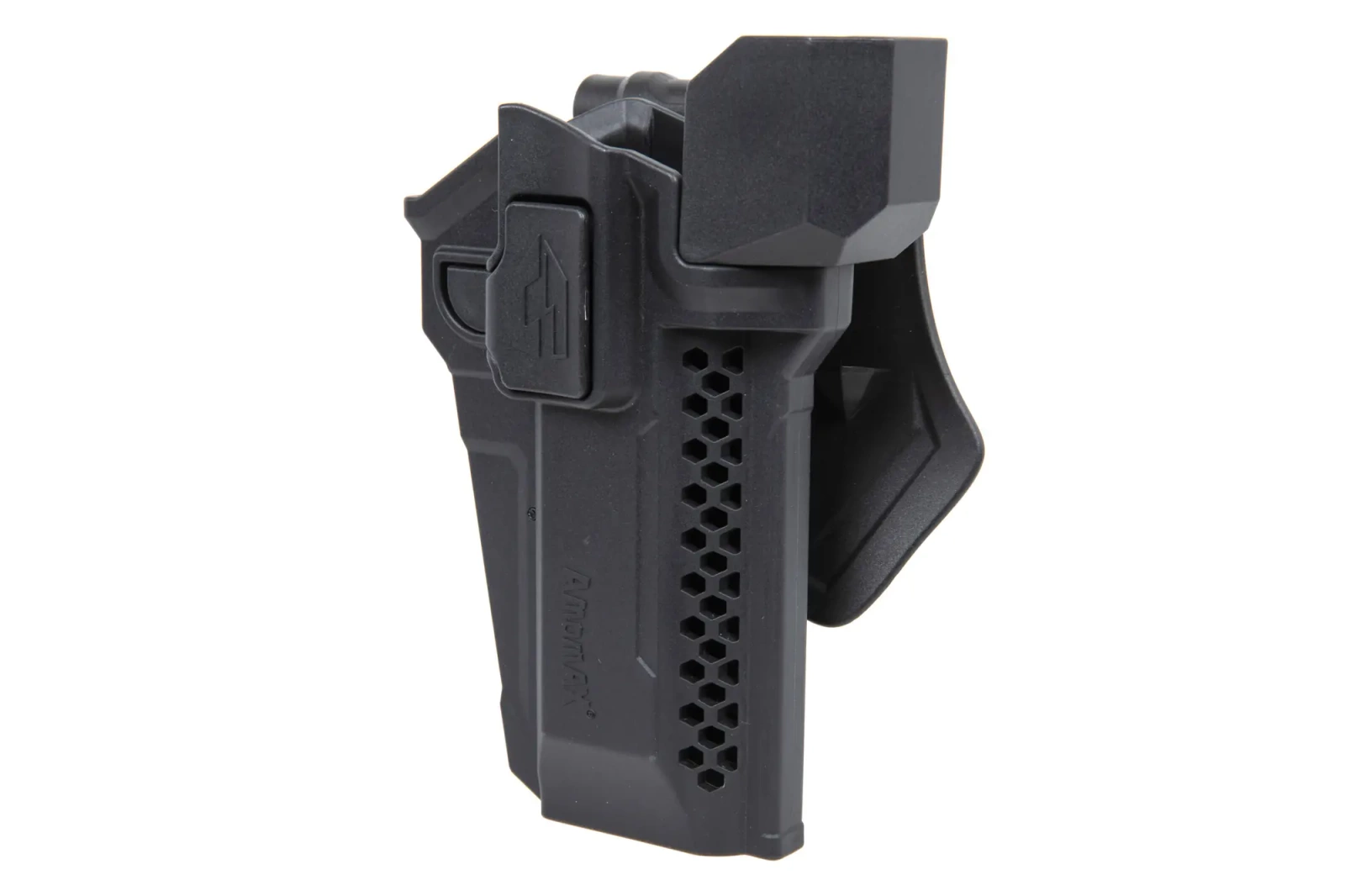 Wyprodukowana z wytrzymałego polimeru przez firmę Amomax kabura pistoletowa. Posiada intuicyjną blokadę zwalnianą palcem wskazującym podczas dobycia ;