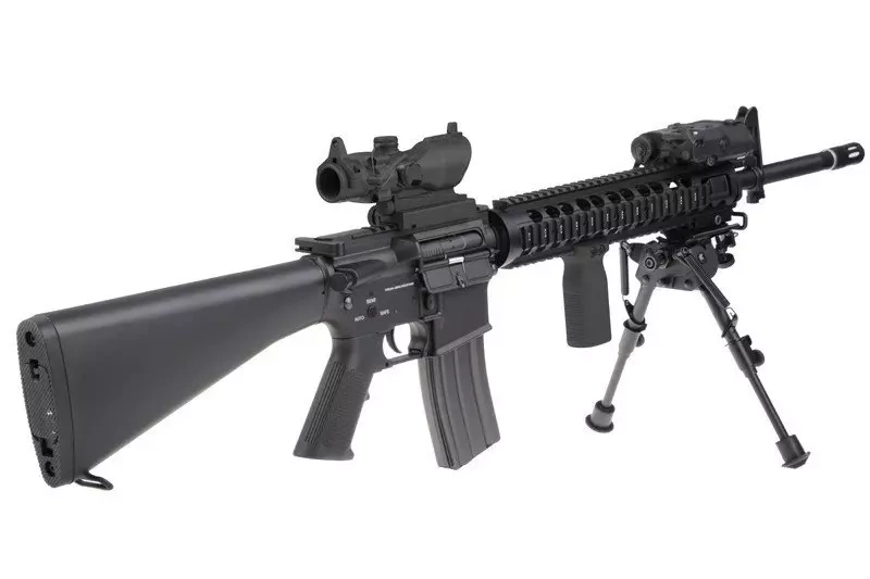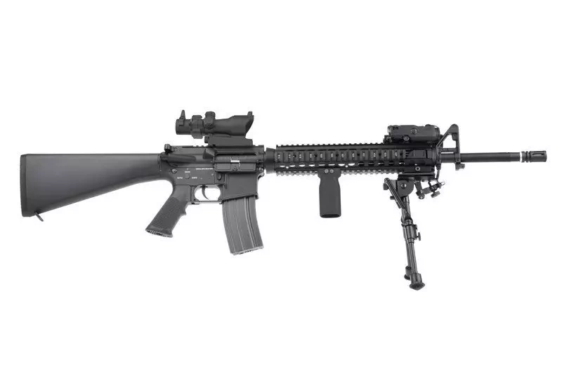 Elektryczna replika karabinka szturmowego SA-B07 wykonana została z metalu, tworzywa sztucznego oraz stali (stalowe są wszystkie śruby, piny oraz uchwyt zawieszenia taktycznego). Mieszczącą akumulator stałą kolbę jak i chwyt pistoletowy wykonano z tworzywa sztucznego. Korpus repliki oraz zespół szyn RIS poddane zostały procesowi anodyzacji. W zestawie z karabinkiem otrzymujesz: • magazynek • dodatkową sprężynę główną W replice zastosowano system szybkiej wymiany sprężyny, tzw. Enter & Convert™. Pozwala to na szybkie i sprawne dostosowanie mocy repliki do warunków spodziewanych na polu rozgrywki bez konieczności posiadania dostępu do warsztatu czy szeregu specjalistycznych narzędzi - po wyjęciu gearboxa z korpusu repliki, sam proces wymiany sprężyny trwa dosłownie kilka sekund. Karabin został w pełni przystosowany do współpracy z akumulatorami typu LiPo oraz LiFe. Dzięki bazowej początkowej prędkości wylotowej rzędu ~410 FPS, replika doskonale nadaje się do prowadzania działań na średnim dystansie. W zestawie załączono również sprężynę typu M90, co pozwala zmniejszyć prędkość początkową do ~310 FPS czyniąc tym samym replikę doskonale przystosowaną do prowadzenia działań na krótkim dystansie czy też wewnątrz budynków. SA-B07 wyposażony został w grzbietową szynę RIS 22 mm, zespół frontowych szyn RIS oraz regulowaną kolbę. Na górnej szynie RIS założony został zdejmowany chwyt transportowy. Standardowy tłumik płomienia osadzony został na 14-milimetrowym lewoskrętnym gwincie, co umożliwia przyłączenie w jego miejsce tłumika dźwięku.