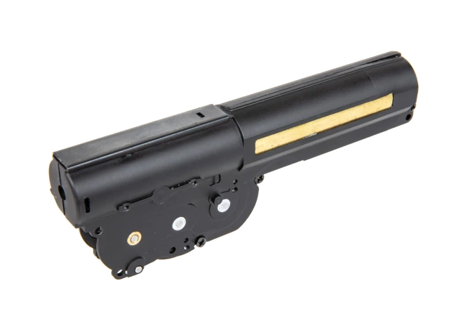 Gearbox jest wyposażony w polikarbonowe łożyska ślizgowe o średnicy 6 mm oraz stalowe zębatki.