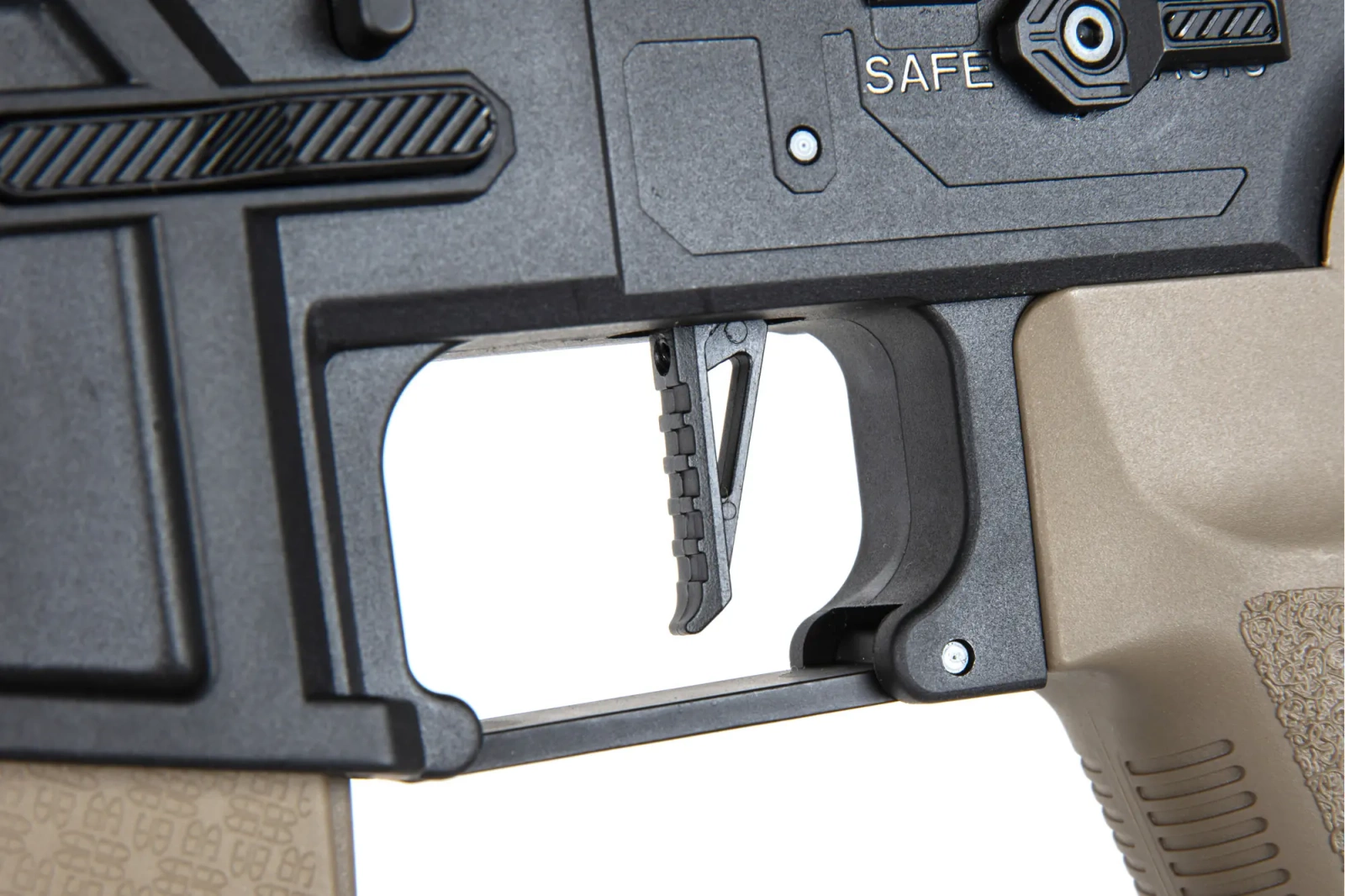 Korpus to autorski projekt Specna Arms łączący w sobie walory estetyczne oraz wysoką ergonomię. Każdy element został wykonany oraz spasowany z dbałością o szczegóły. Model posiada obustronne powiększone manipulatory (selektor oraz zwalniacz magazynka) oraz funkcjonalny bolt-catch.