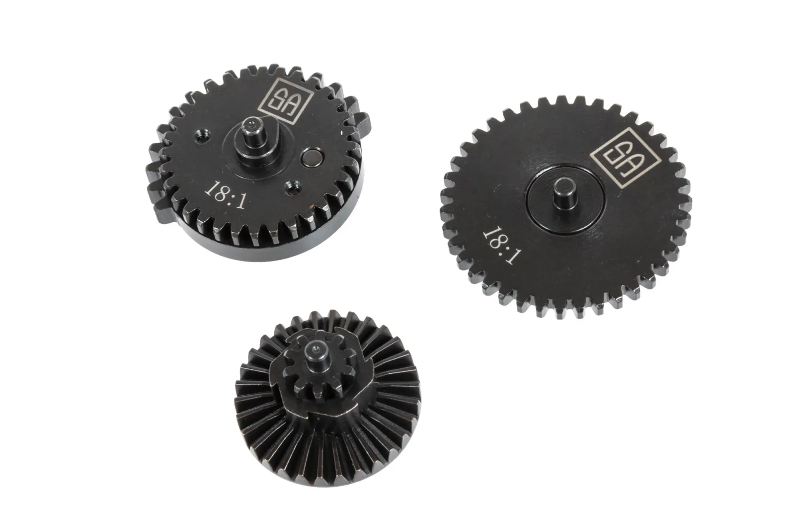 Zestaw stalowych zębatek wysokiej jakości o przełożeniu 18:1 wykonane przy użyciu precyzyjnych maszyn CNC. Bardzo dokładna obróbka wpływa korzystnie na pracę mechanizmu, poprawiając osiągi, redukując hałas i zmniejszając konsumpcje prądu.