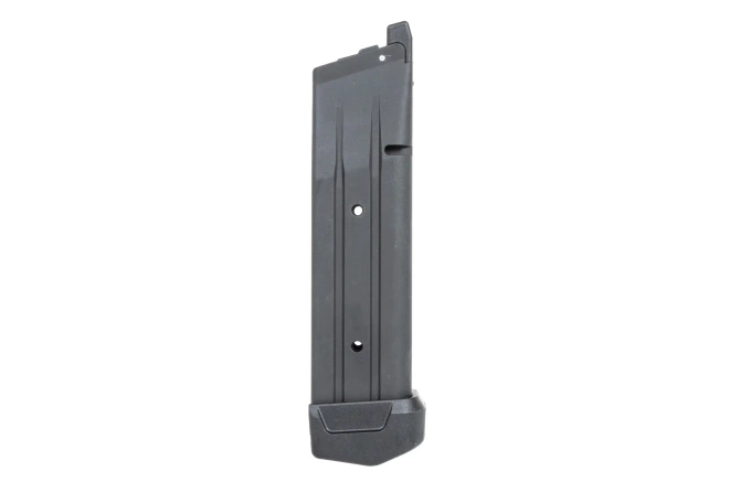 Magazynek zasilany kapsułą CO2 na 30 kulek, został wykonany przy wykorzystaniu aluminium (korpus magazynka) oraz tworzywa sztucznego (powiększona stopka).