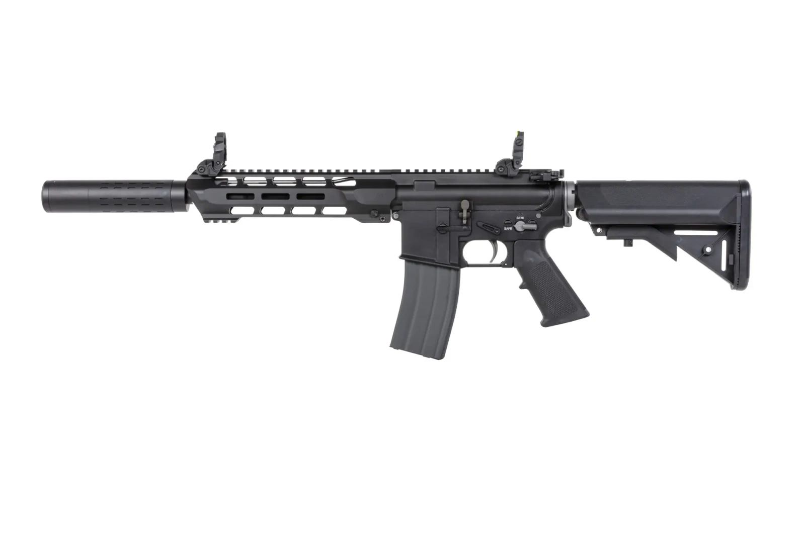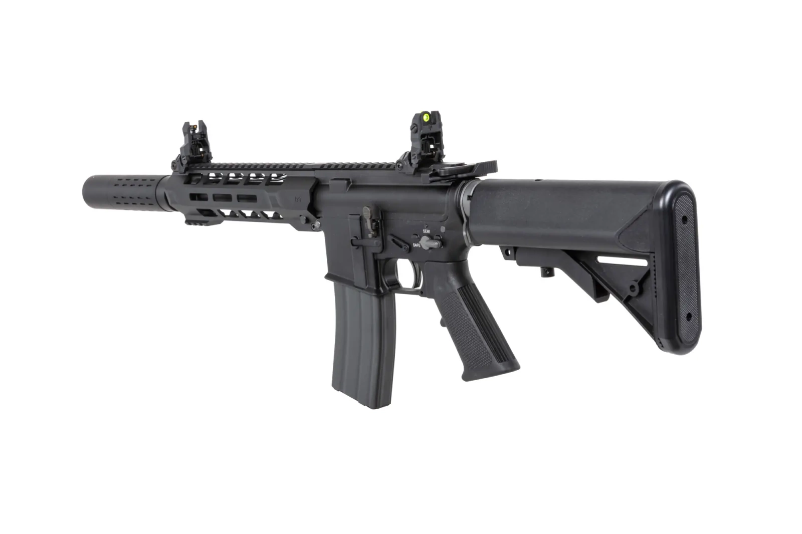 Z aluminium wykonano: korpus, łoże kompatybilne z systemem M-LOK, grzbietową szynę RIS, lufę zewnętrzną, atrapę bloku gazowego, prowadnicę kolby, obustronną rączkę przeładowania, replikę tłumika dźwięku oraz forward assist. Ze stali uświadczymy: elementy wewnętrzne w tym suwadło, klapkę wyrzutnika łusek, rurę gazową, manipulatory, język spustowy, magazynek, montaż zawieszenia taktycznego, wszystkie śruby i piny. Dodatkowo z wytrzymałego tworzywa wykonano chwyt pistoletowy, regulowaną kolbę oraz światłowodowe, składane przyrządy celownicze.