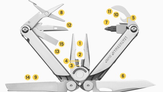 To narzędzie uniwersalne zawiera przyrządy, które są dostępne, gdy narzędzie jest w pozycji złożonej lub zamkniętej, imitując funkcjonalność scyzoryka.
