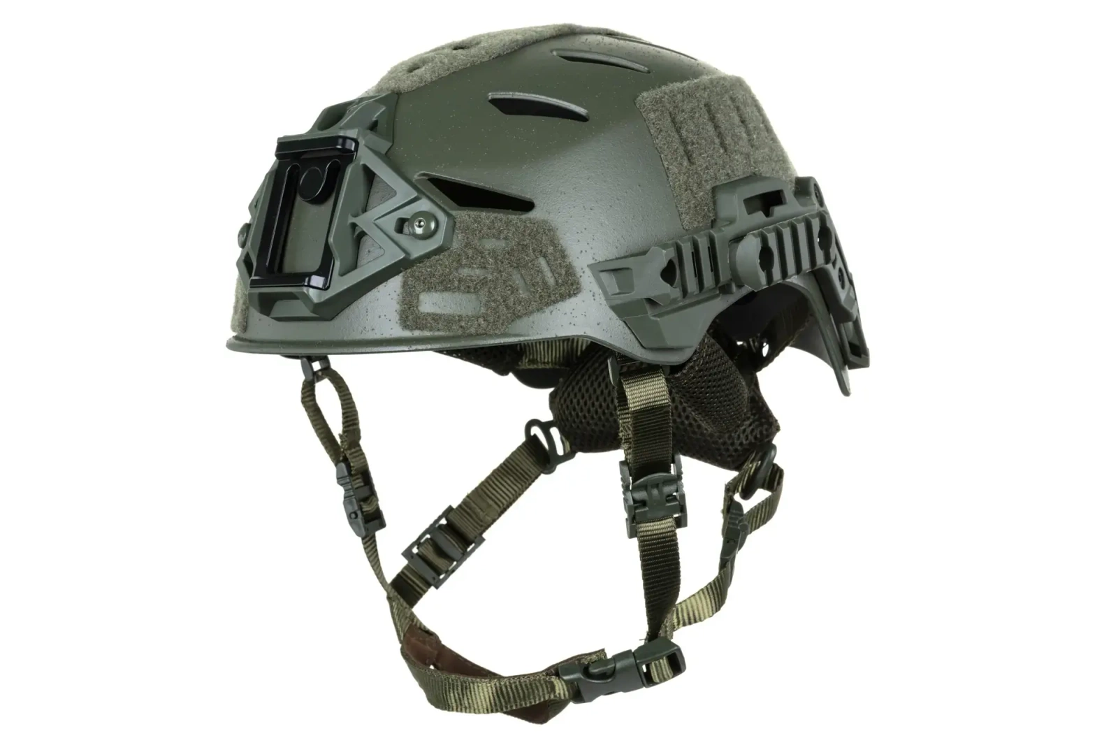 Po bokach znajdują się szyny montażowe, które pozwolą na zamontowanie dodatkowego wyposażenia ;słuchawki. Front repliki ma mocowanie na urządzenia NVG. W zestawie znajdziemy również linki odciągowe. Na sporej powierzchni skorupy hełmu znajdują się rzepy, które pozwolą na mocowanie naszywek typu morale-patch, oznaczeń, znaczników typu e-lite, etc.