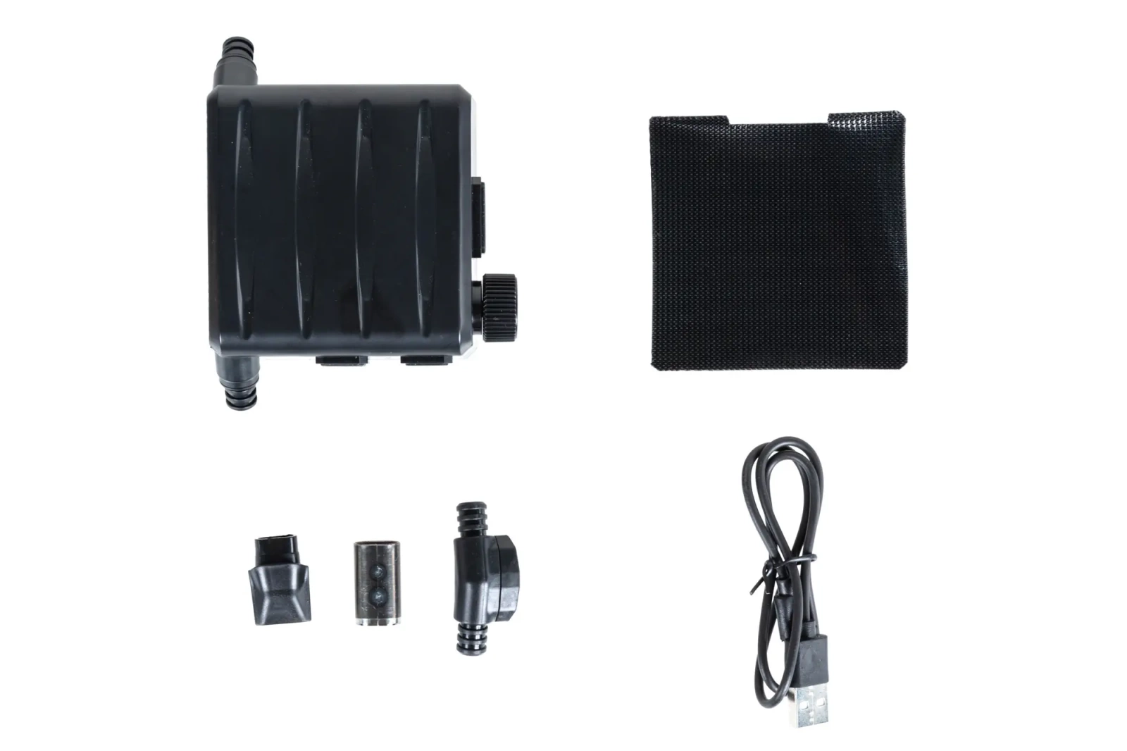 W zestawie otrzymujemy przede wszystkim urządzenie generujące strumień zimnego powietrza, które poprowadzone przy pomocy elastycznych rurek, dociera do gogli, pozwalając cieszyć się czystymi szkłami nawet podczas największego wysiłku w upalny dzień. Strumień można regulować przy pomocy pokrętła, a w sytuacji szczególnie napiętej i intensywnej, pozostaje tryb Turbo.