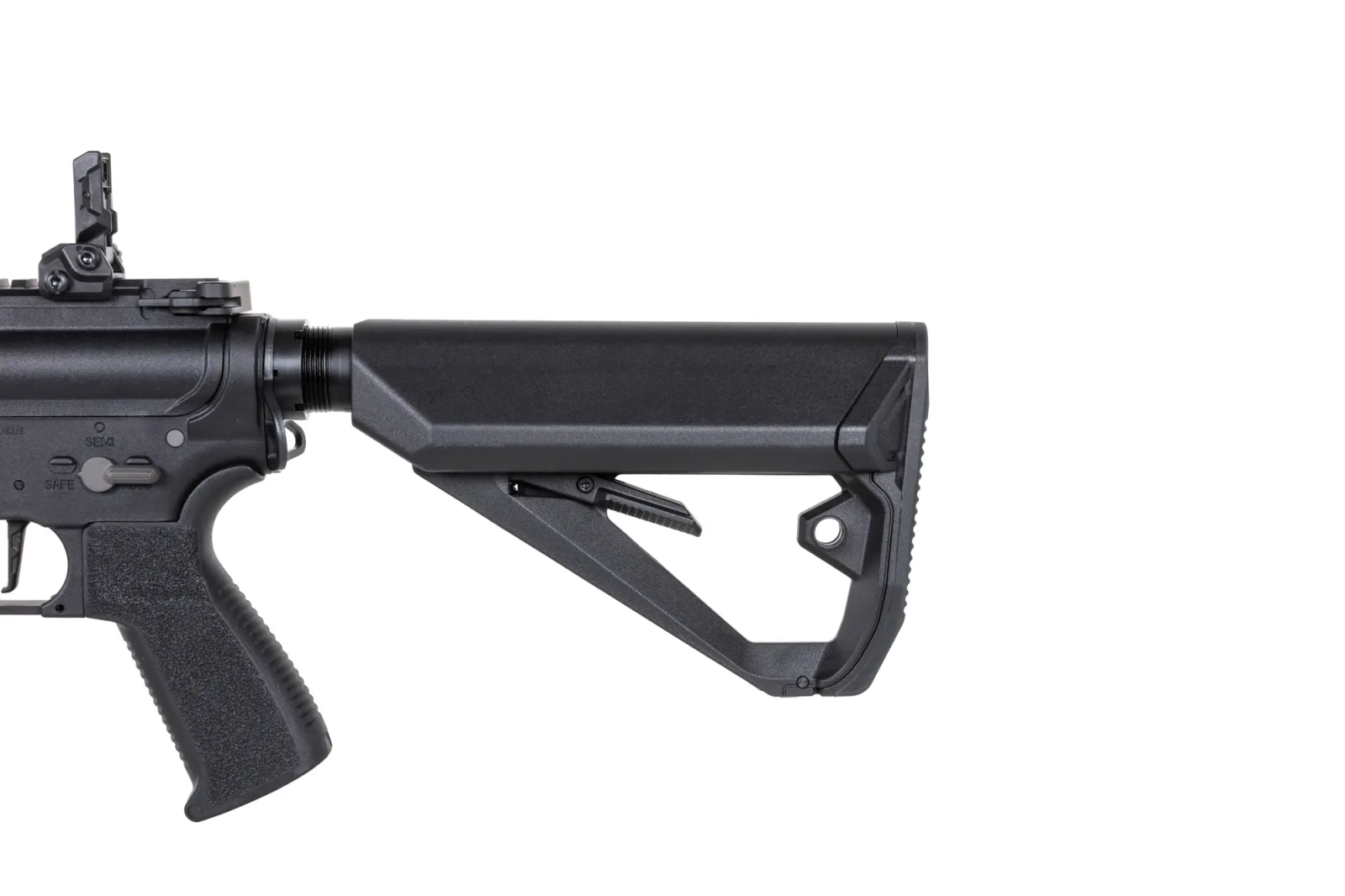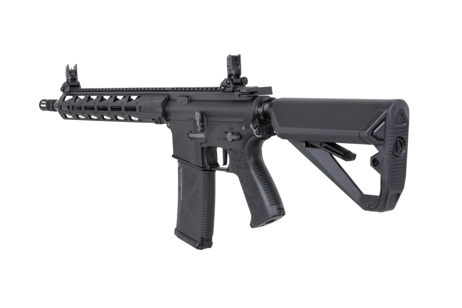 Jednocześnie z aluminium wykonano urządzenie wylotowe, manipulatory (bolt-catch - działający, selektor, zatrzask magazynka), dźwignie przeładowania. Z polimeru uświadczymy korpus z łożem M-LOK o długości cala. Na łożu znajdziemy grzbietową szynę RIS, która umożliwi mocowanie np. lunety czy kolimatora. Z polimeru wykonano również: ergonomiczny chwyt pistoletowy, który posiada chropowatą powierzchnie, magazynek, ergonomiczną, regulowaną kolbę, w której pomieścimy akumulator oraz składane przyrządy celownicze.