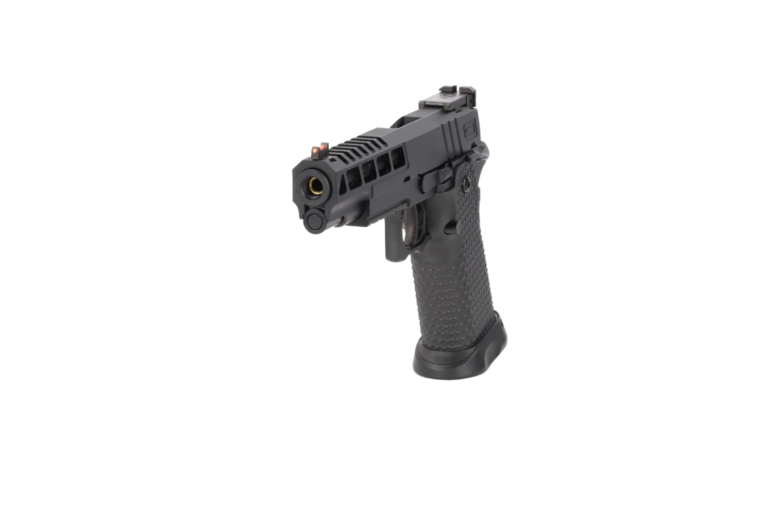 Chropowata rękojeść wykonana z tworzywa zapewnia pewny, antypoślizgowy chwyt podczas dynamicznych manewrów a powiększony lejek ułatwi przeładowanie.