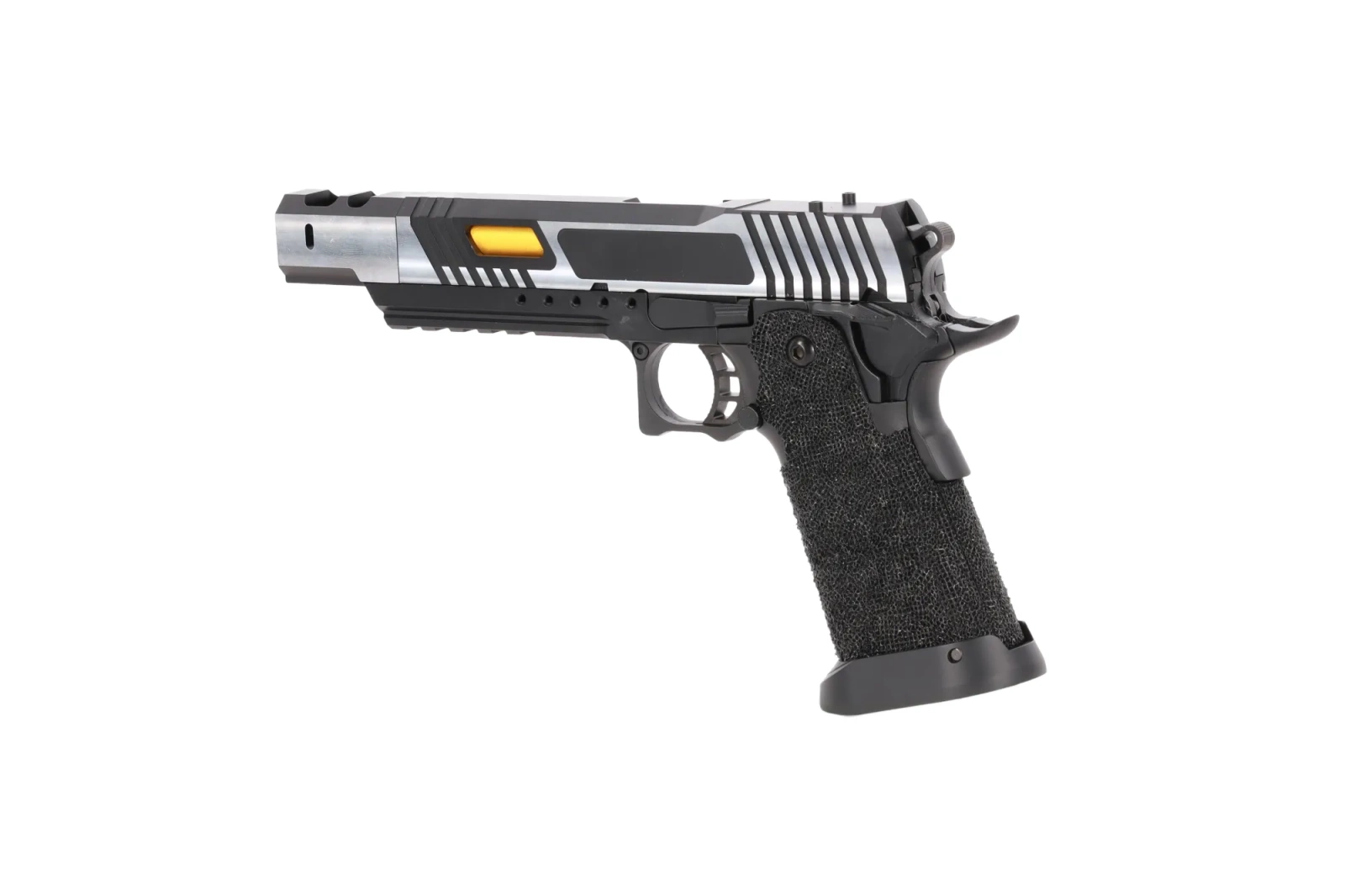 Chropowata rękojeść (ręcznie robiony stippling) wykonana z tworzywa zapewnia pewny, antypoślizgowy chwyt podczas dynamicznych manewrów a powiększony lejek ułatwi przeładowanie.