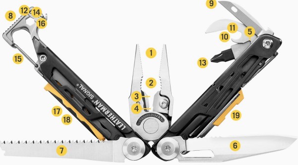 To narzędzie uniwersalne zawiera przyrządy, które są dostępne, gdy narzędzie jest w pozycji złożonej lub zamkniętej, imitując funkcjonalność scyzoryka.