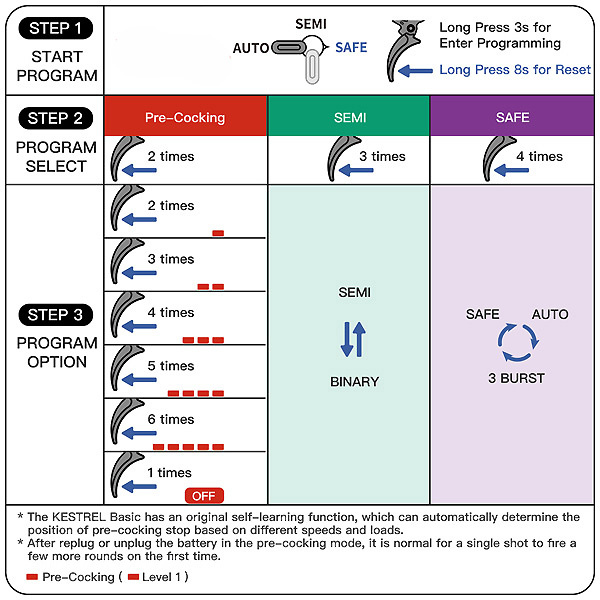 • Regulacja wstępnego napinania: 5 różnych poziomów wstępnego napinania tłoka do programowania. Model KESTREL Basic posiada funkcję uczenia, która automatycznie określa pozycję zatrzymania wstępnego napinania w zależności od różnych prędkości i obciążeń. Normalne jest, że po ponownym podłączeniu lub odłączeniu baterii jedno naciśnięcie spustu może spowodować wystrzał kilku kolejnych kulek.