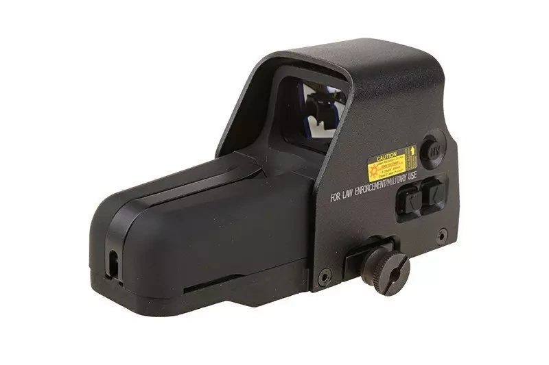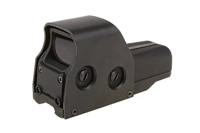 Replika wzorowana na konstrukcji popularnego celownika holograficznego stosowanego do broni palnej. Zamknięty w solidnej, wytrzymałej obudowie wykonanej praktycznie w całości z metalu, zapewniającej odporność na czynniki zewnętrzne. W komplecie znajdziemy także osłony na szkła. Punkt celowniczy może być wyświetlany w kolorze czerwonym bądź zielonym.