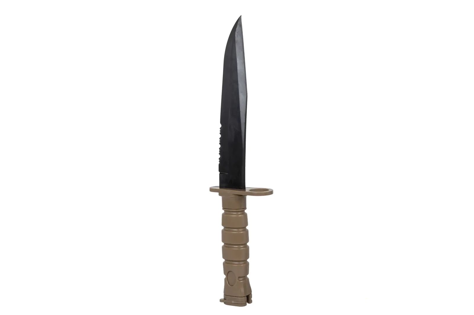 Głownia noża została wykonana z wytrzymałego, ale giętkiego tworzywa sztucznego. Rękojeść posiada żebrowaną fakturę, co zapewnia pewny chwyt. Podstawa rękojeści posiada montaż do replik typu M4/M16. Atrapa idealna do treningów, symulacji, etc.