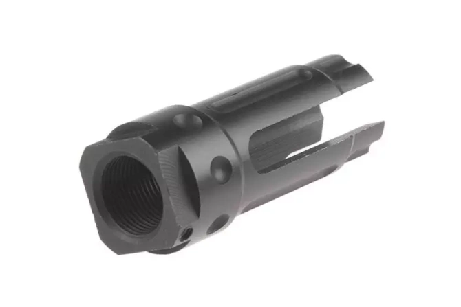 Tłumik płomienia wykonany został w całości z metalu a jego zwarta konstrukcja i jednobryłowy odlew zapewnią wytrzymałość i długi czas użytkowania. Model zaopatrzony w standardowy, lewoskrętny gwint o przekroju 14mm.