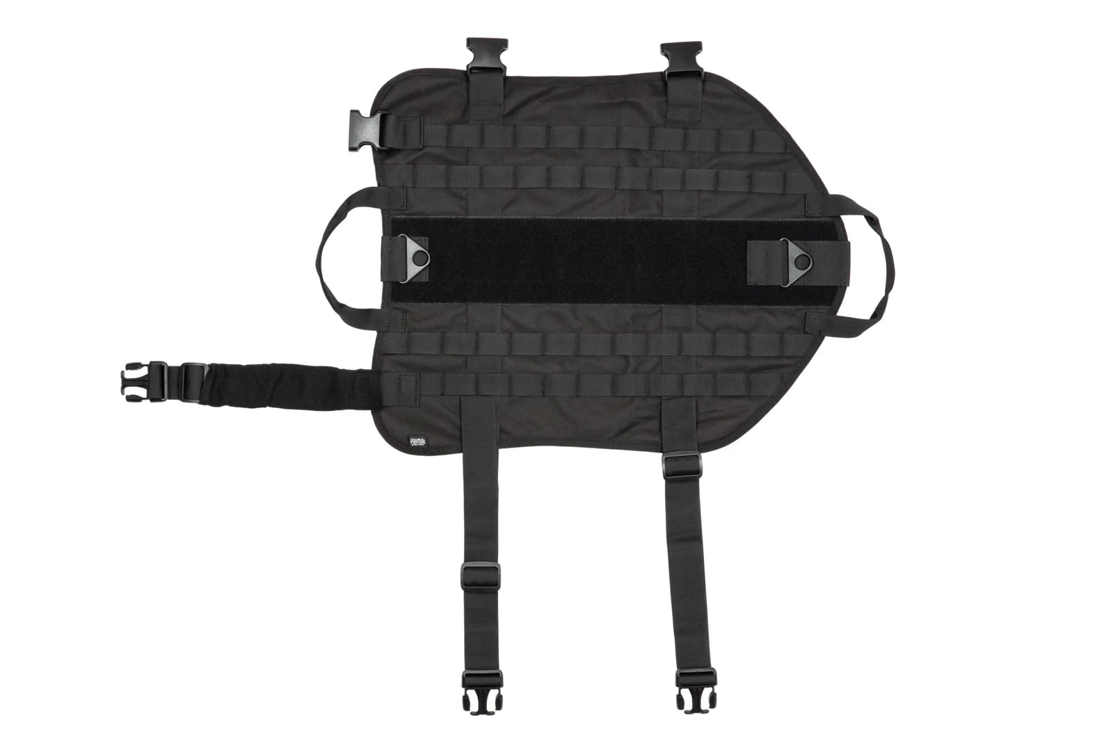 Przednia taśma została wyposażona w miękki rękaw / comfort pad. Kamizelka posiada 2 uchwyty do przytrzymania psa oraz 2 metalowe zaczepy do mocowania smyczy. Na grzbiecie, na całej długości umieszczono duży panel rzepa, a po bokach rzędy taśm systemu MOLLE / PALS, które umożliwiają montaż oraz dowolną konfigurację dodatkowych kieszeni i ładownic.