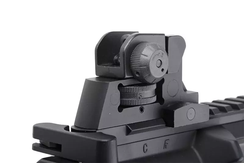 Replika zaopatrzona jest w wielopozycyjną, teleskopową kolbę typu SF - z grubą, gumową stopką, otworami do mocowania zawieszenia taktycznego QD. Na grzbiecie korpusu znajduje się szyna RIS 22mm z regulowaną szczerbinką. Replika wyposażona jest także w chwyt przedni z szynami RIS 22mm które umożliwiają montaż dodatkowych akcesoriów jak kolimatory czy latarki taktyczne. Całość wieńczy w pełni stalowy tłumik płomieni. W zestawie znajduje się stalowy magazynek typu hi-cap mieszczący około 300 kulek.
