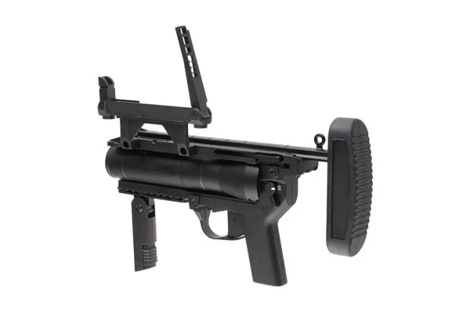 ST320A1 to wersja "stand alone" popularnego granatnika dedykowanego do replik karabinka G36. Zamiast montażu do łoża znajdziemy tu teleskopową kolbę oraz przedni chwyt pionowy, które pozwolą korzystać z granatnika jako z samodzielnej jednostki i prowadzić z niego wygodny i skuteczny ogień.