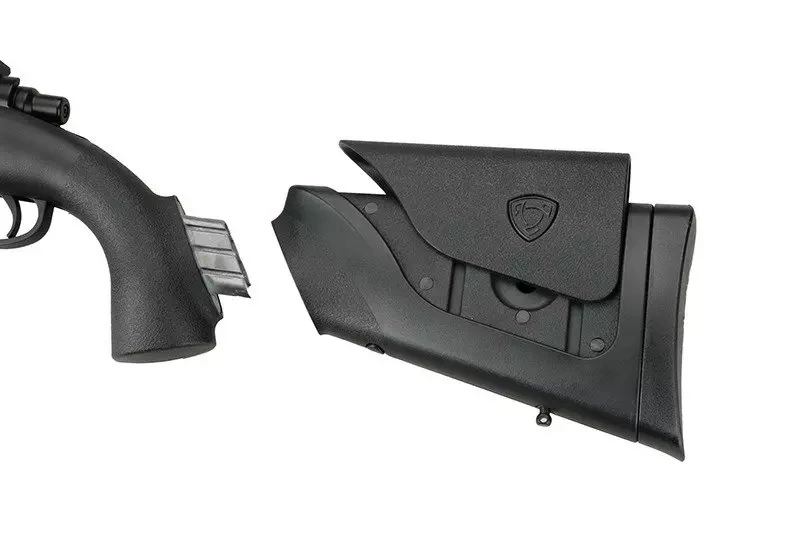 Nowy karabin snajperski produkcji firmy APS wprowadził nową siłę na pole airsoftowej bitwy. Lekka i wygodna konstrukcja osadzona została w wytrzymałym łożu o demontowalnej kolbie, co gwarantuje wysoką manewrowość i wygodę użytkowania. Regulowana baka pozwala dodatkowo dostosować replikę do preferencji i budowy strzelca, jak również rodzaju używanej lunety i warunków działania.