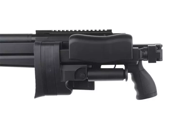 Pokrętło regulacji systemu Hop-Up znajduje się na spodniej części łoża. Zapewnia to natychmiastowy dostęp, ustawienie Hop-Up możemy korygować dzięki temu na bieżąco, nawet podczas prowadzenia ognia. Ergonomiczna kolba repliki posiada teleskopową podstawę oraz płynnie regulowaną poduszkę policzkową. W replice zamontowano wygodny, profilowany chwyt pistoletowy. Co ważne, w jego miejsce będzie pasował dowolny chwyt dedykowany dla replik karabinków typu M4/M16.