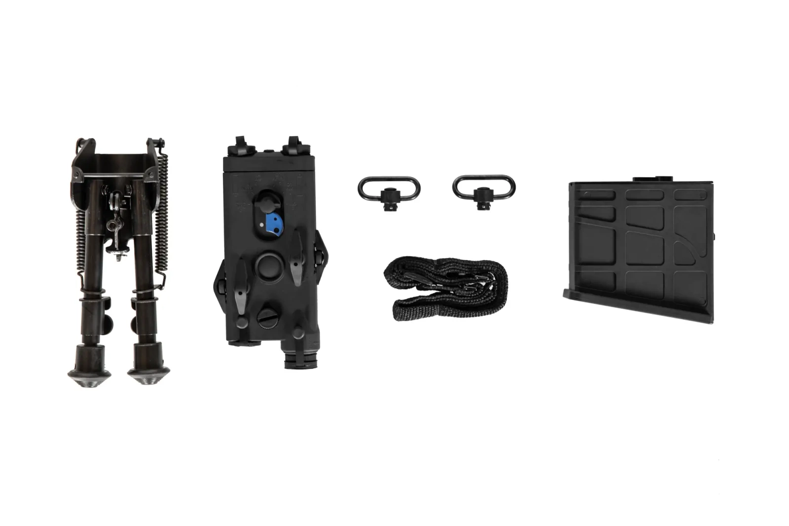 Na grzbiecie korpusu znajduję się długa szyna montażowa umożliwiająca zamontowanie dodatkowych akcesoriów, po bokach oraz pod lufą także umieszczono szyny montażowe. Replika posiada składaną na bok kolbę co ułatwi jej transport. Kolba posiada regulowaną poduszkę podpoliczkową. Baterię umieścić możemy w znajdującej się w zestawie puszcze typu PEQ, wtyczka TAMYIA mini wypuszczona jest w prawej strony repliki.