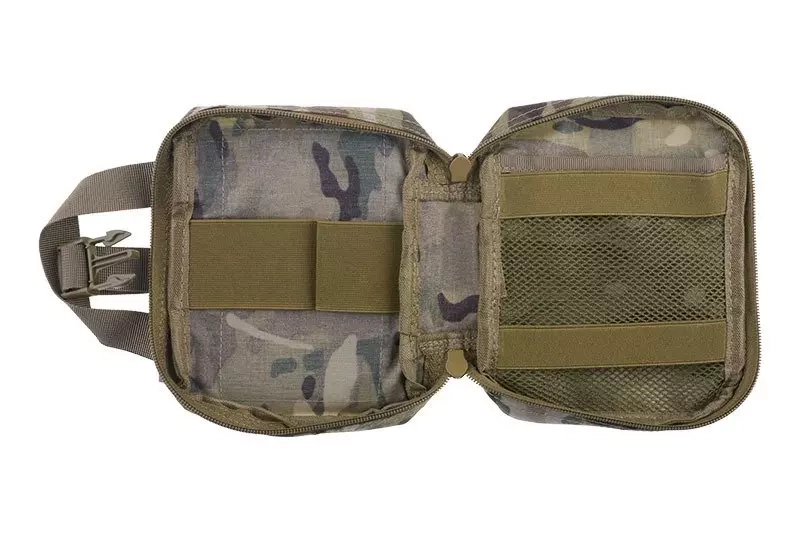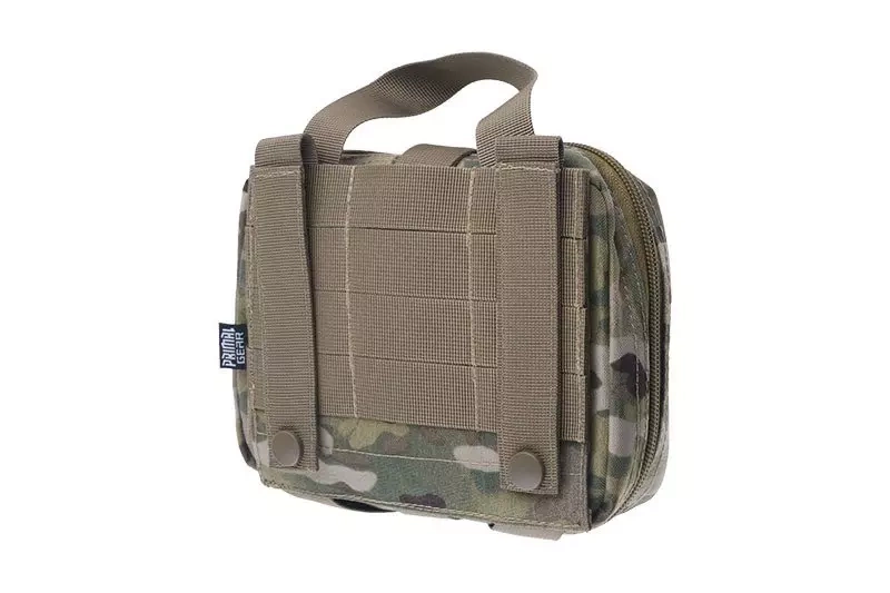 Wykonana z wytrzymałej Cordury 500D przez Primal Gear ładownica o zastosowaniu osobistej apteczki polowej. Ładownica, zamykana dwubiegunowym zamkiem, rozpina się do samego dołu dzięki czemu uzyskujemy szybki i łatwy dostęp do całej zawartości. Organizację zawartości ułatwiają taśmy elastyczne oraz płaska, siatkowa kieszeń. Dla łatwości dostępu do zawartości ładownicę wyposażono w panel rzepowy na tylnej ścianie - apteczkę można "zerwać" z plecaka lub oporządzenia bez konieczności jego ściągania. Ładownica dodatkowo zabezpieczona jest taśmą z klamrą. Na przedniej ściance apteczki znajduje się mała płaska kieszonka zamykana na rzep oraz mały panel rzepowy np. na moral patch.
