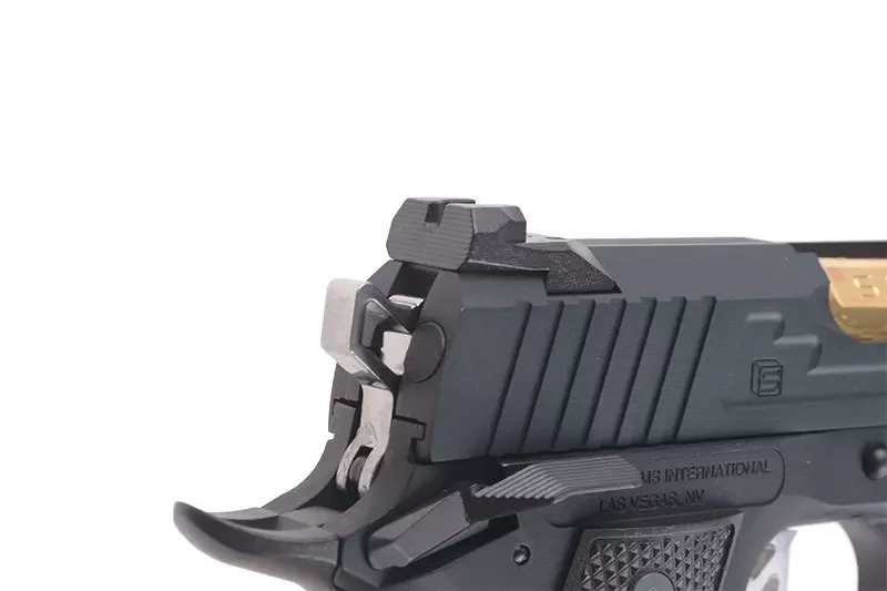 Na metalowy zamek oraz korpus naniesiono oryginalne oznaczenia producenta Salient Arms International™. Replika zaopatrzona jest w dwustronny bezpiecznik skrzydełkowy blokujący mechanizm spustu i uniemożliwiający oddanie przypadkowego strzału. Dostęp do bezpiecznika jest bardzo prosty zarówno dla osób lewo- jak i praworęcznych - dźwignia mechanizmu znajduje się w zasięgu kciuka. W modelu tym zastosowano funkcjonalny tylny bezpiecznik dociskowy, który wymusza prawidłowy chwyt w celu oddania strzału. Customowy język spustowy oraz dźwignia kurka nadają replice ciekawy, przyciągający wzrok wygląd. Wzrok przykują także pomalowane na złoty kolor elementy lufy zewnętrznej.