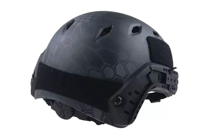 Replika kasku FAST Base Jump wyprodukowana przez firmę FMA. Do wykonania produktu użyto wysokiej jakości tworzywa sztucznego. Specyficzna konstrukcja i nieznaczna waga sprawiają, że kask ten jest bardzo wygodny w użytkowaniu. Zastosowany przez producenta fasunek pozwala na wygodne i pewne osadzenie na głowie użytkownika. Produkt posiada również otwory zapewniające odpowiednią wentylację.